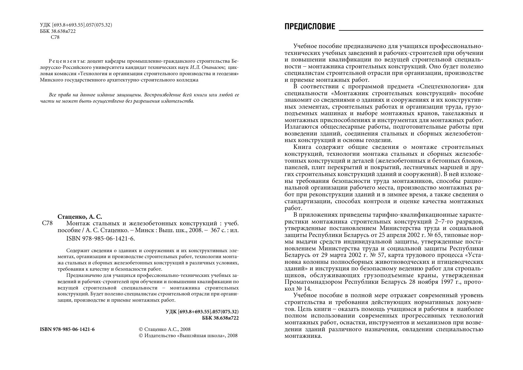 Содержит сведения о зданиях и сооружениях и их конструктивных элементах, организации и производстве строительных работ, технологии монтажа стальных и сборных железобетонных конструкций в различных условиях, требования к качеству и безопасности работ. Для учащихся ПТУ и рабочих-строителей при обучении и повышении квалификации по ведущей строительной специальности - монтажника строительных конструкций. Будет полезно специалистам строительной отрасли при организации, производстве и приемке монтажных работ
