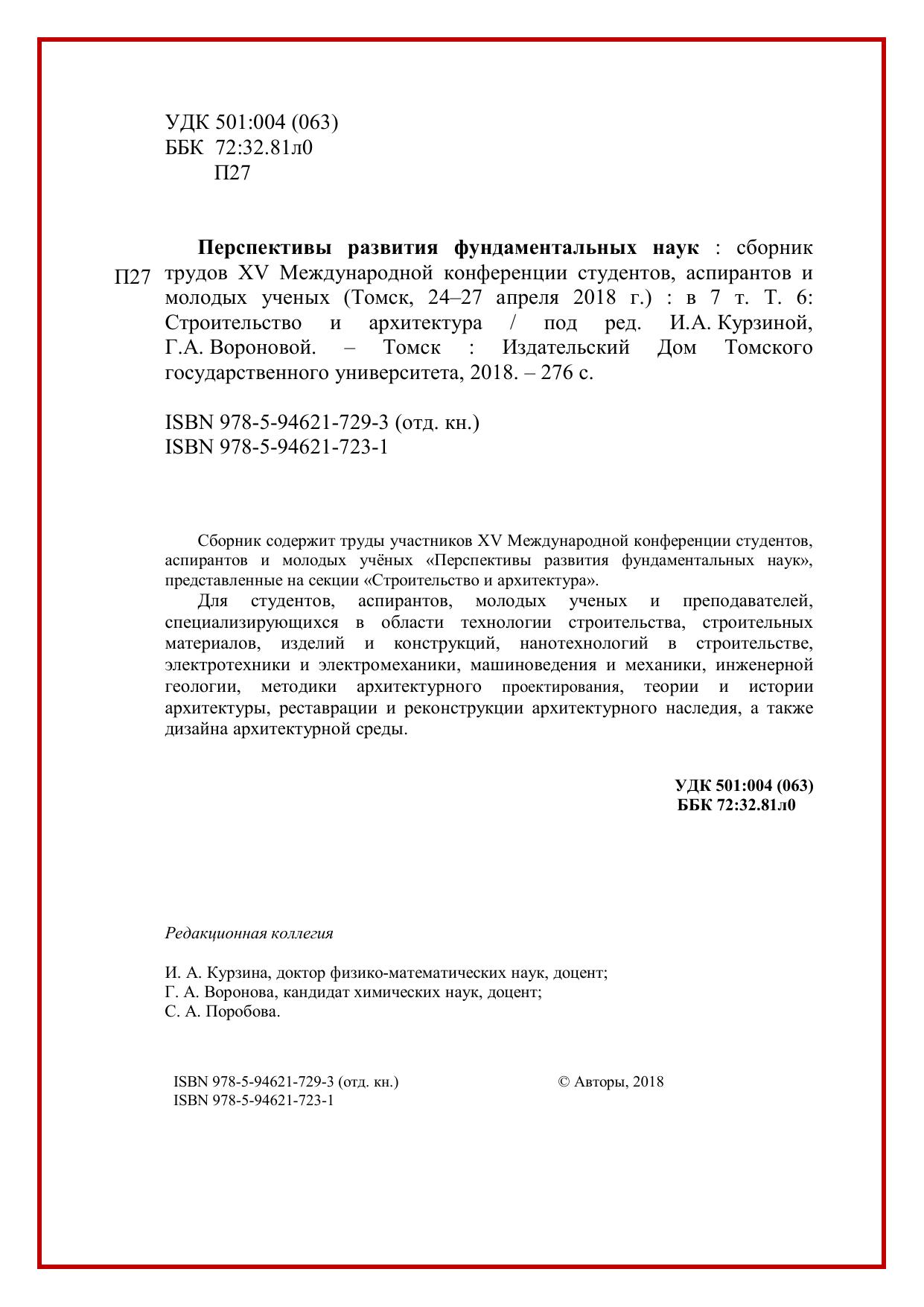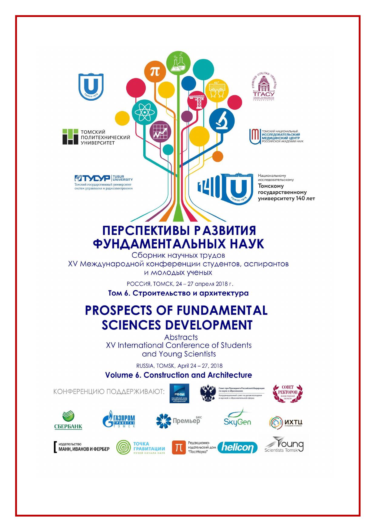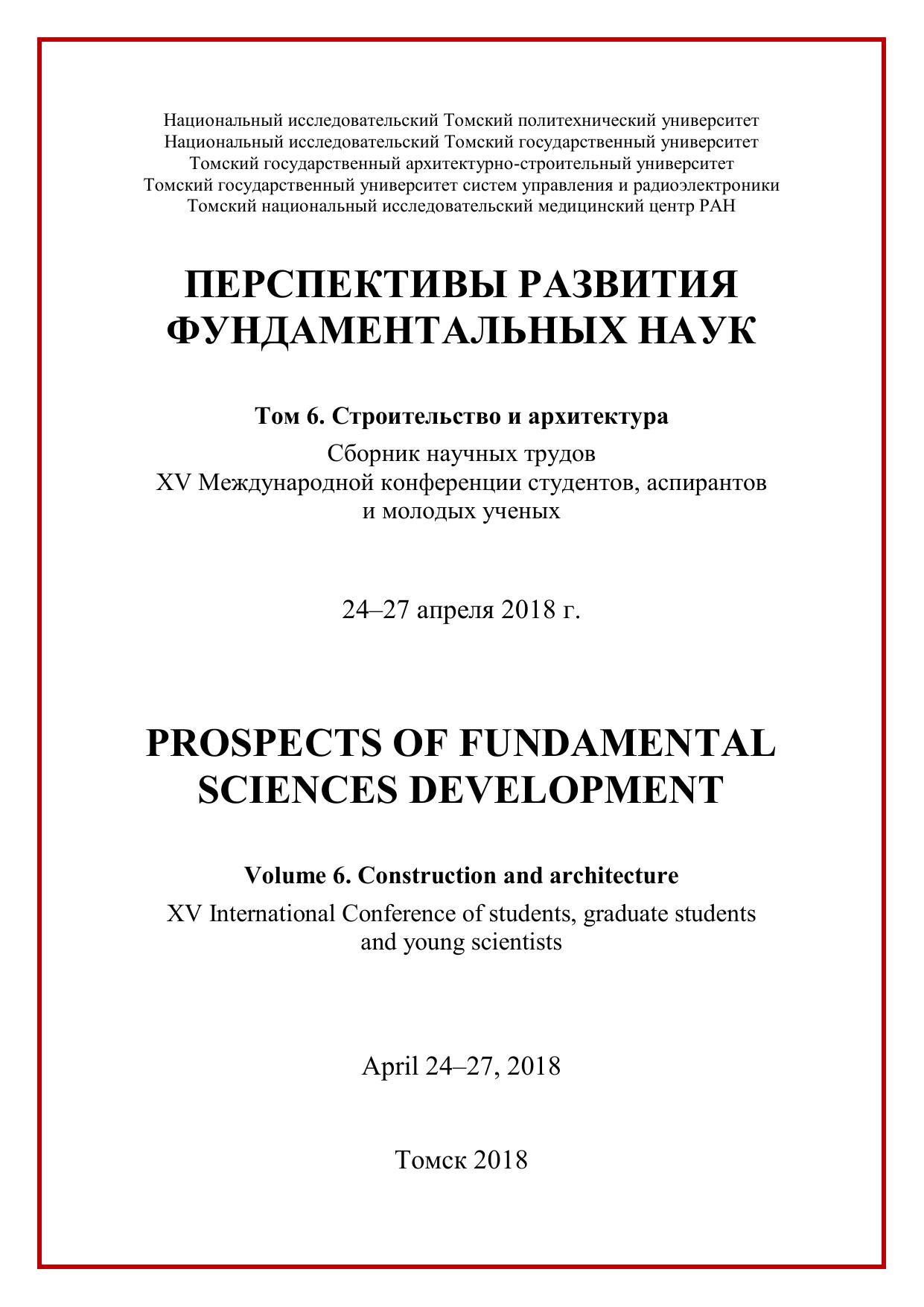 Сборник содержит труды участников XV Международной конференции студентов, аспирантов и молодых учёных «Перспективы развития фундаментальных наук», представленные на секции «Строительство и архитектура». Для студентов, аспирантов, молодых ученых и преподавателей, специализирующихся в области технологии строительства, строительных материалов, изделий и конструкций, нанотехнологий в строительстве, электротехники и электромеханики, машиноведения и механики, инженерной геологии, методики архитектурного проектирования, теории и истории архитектуры, реставрации и реконструкции архитектурного наследия, а также дизайна архитектурной среды.