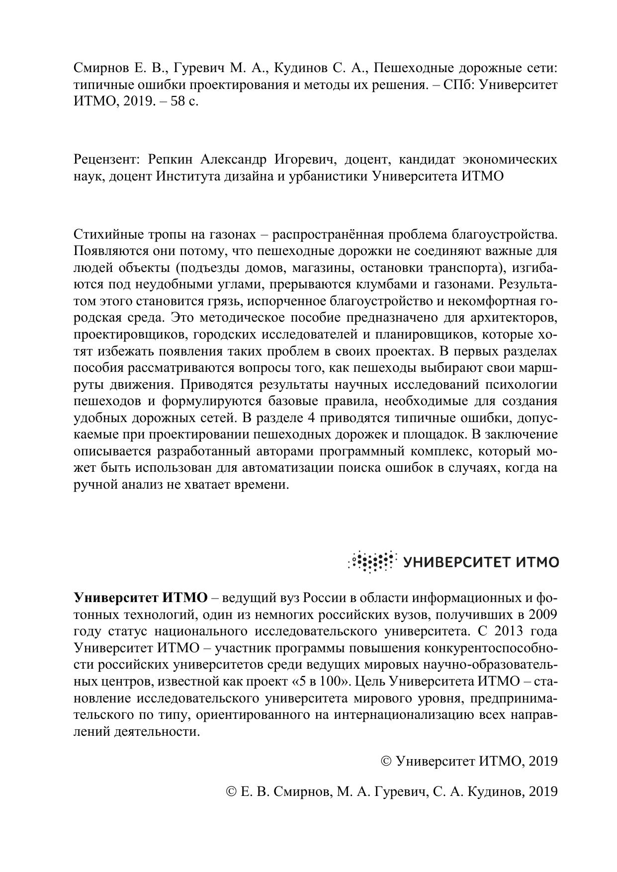 Стихийные тропы на газонах – распространённая проблема благоустройства. Появляются они потому, что пешеходные дорожки не соединяют важные для людей объекты (подъезды домов, магазины, остановки транспорта), изгибаются под неудобными углами, прерываются клумбами и газонами. Результатом этого становится грязь, испорченное благоустройство и некомфортная городская среда. Это методическое пособие предназначено для архитекторов, проектировщиков, городских исследователей и планировщиков, которые хотят избежать появления таких проблем в своих проектах. В первых разделах пособия рассматриваются вопросы того, как пешеходы выбирают свои маршруты движения. Приводятся результаты научных исследований психологии пешеходов и формулируются базовые правила, необходимые для создания удобных дорожных сетей. В разделе 4 приводятся типичные ошибки, допускаемые при проектировании пешеходных дорожек и площадок. В заключение описывается разработанный авторами программный комплекс, который может быть использован для автоматизации поиска ошибок в случаях, когда на ручной анализ не хватает времени