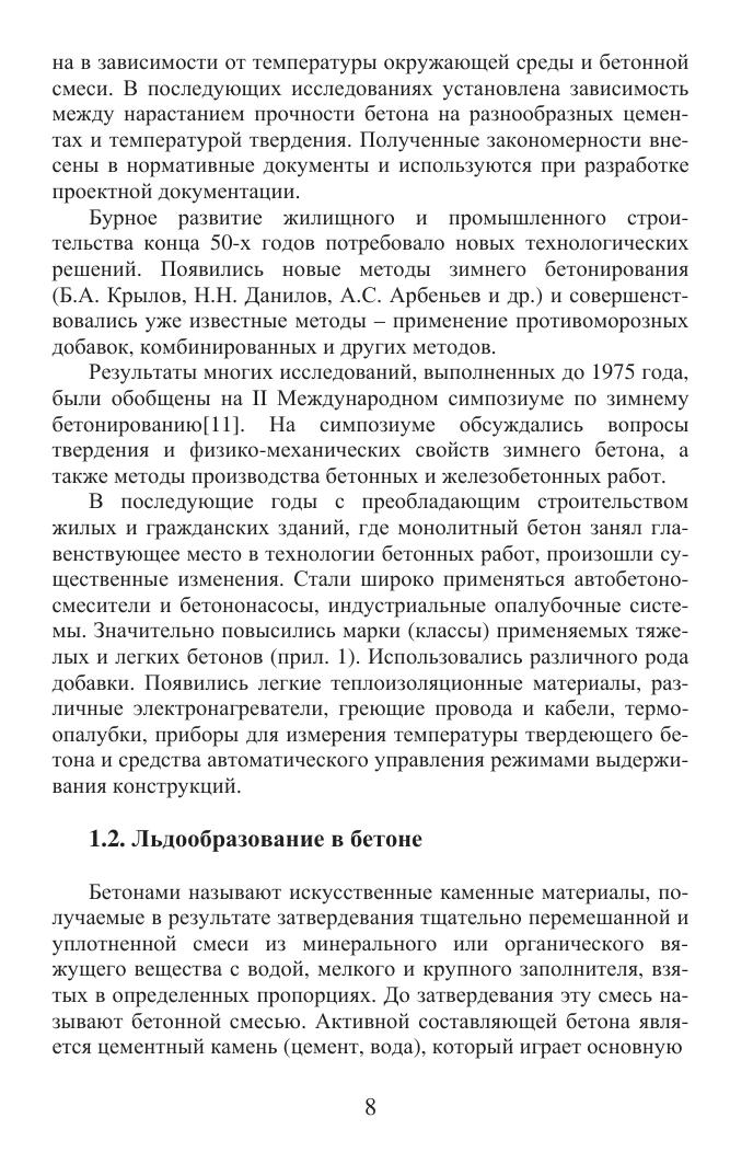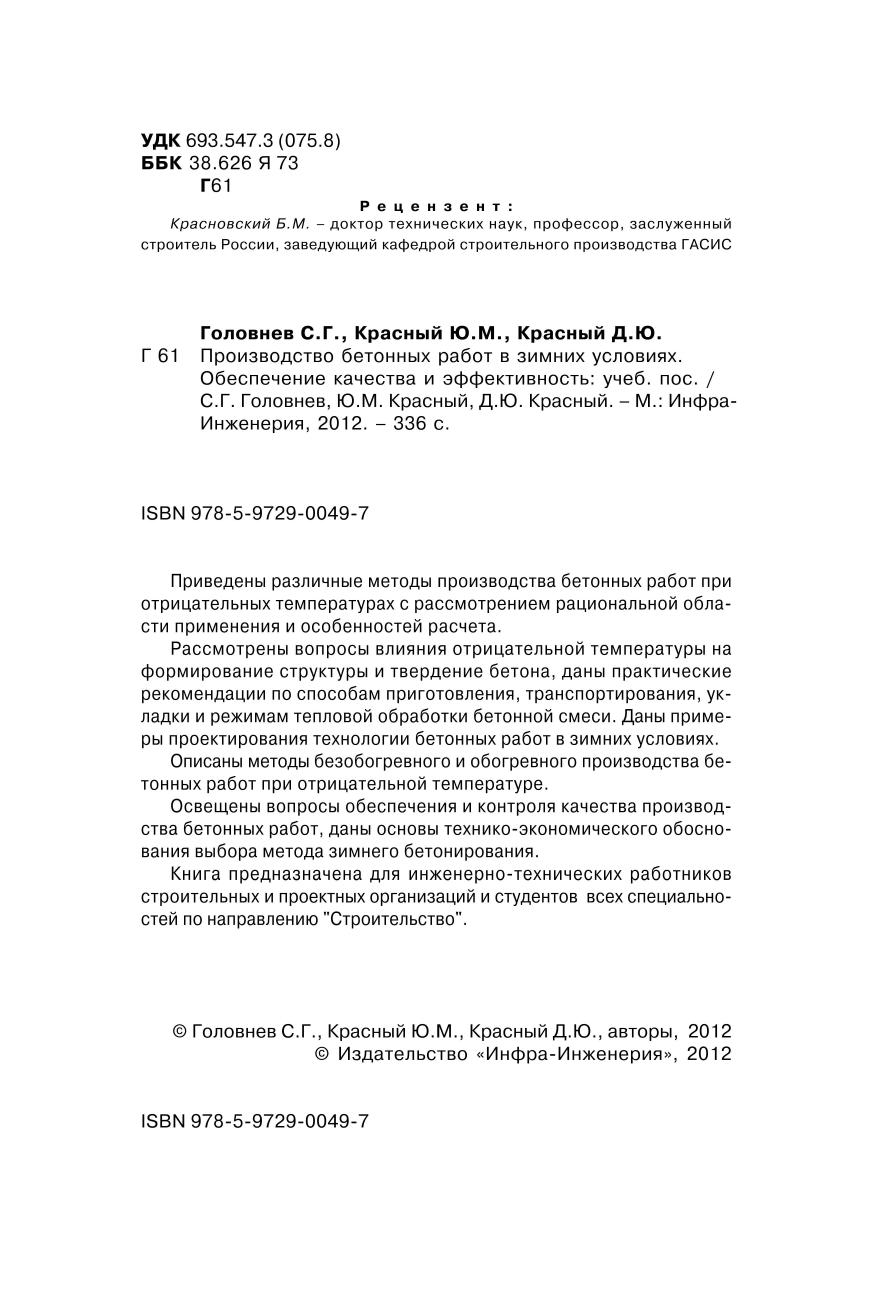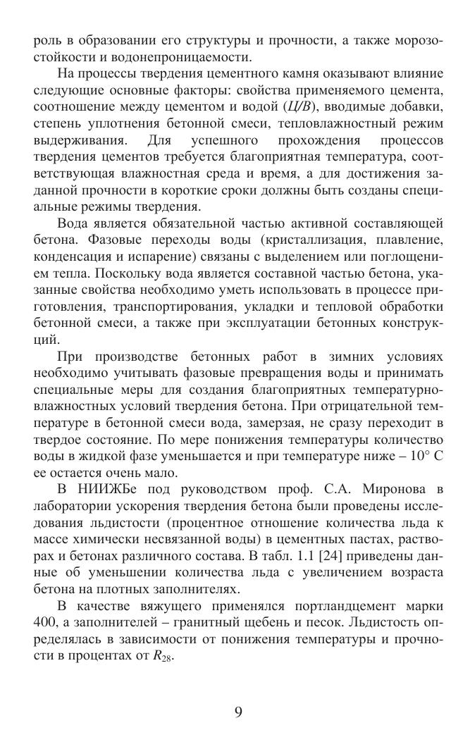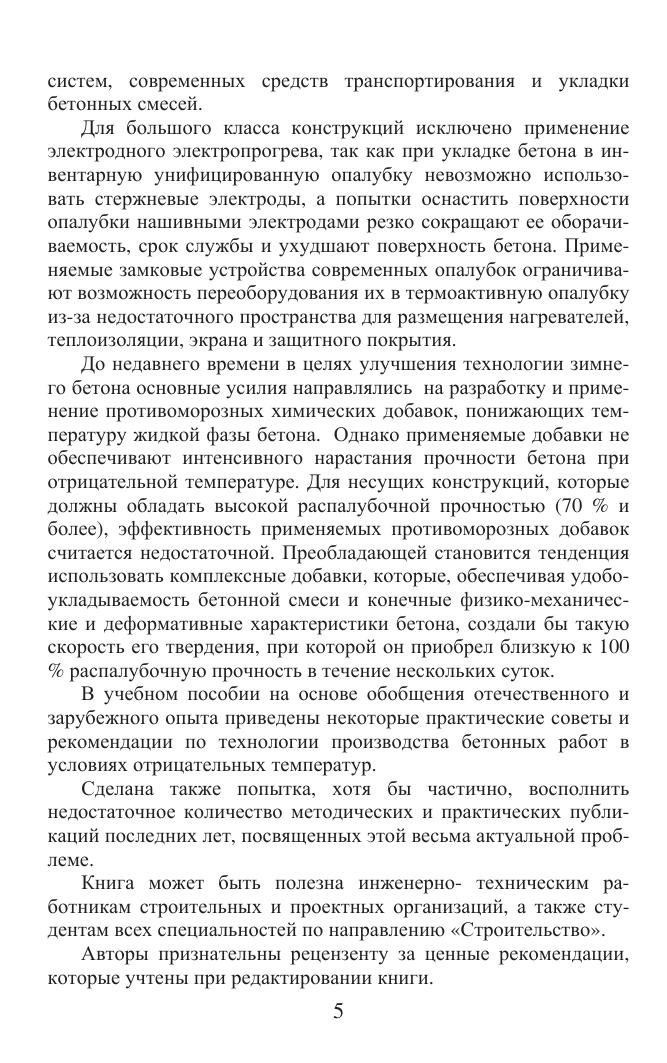 Приведены различные методы производства бетонных работ при отрицательных температурах с рассмотрением рациональной области применения и особенностей расчета. Рассмотрены вопросы влияния отрицательной температуры на формирование структуры и твердение бетона, даны практические рекомендации по способам приготовления, транспортирования, укладки и режимам тепловой обработки бетонной смеси. Даны примеры проектирования технологии бетонных работ в зимних условиях. Описаны методы безобогревного и обогревного производства бетонных работ при отрицательной температуре. Освещены вопросы обеспечения и контроля качества производства бетонных работ, даны основы технико-экономического обоснования выбора метода зимнего бетонирования. Книга предназначена для инженерно-технических работников строительных и проектных организаций и студентов всех специальностей по направлению "Строительство".