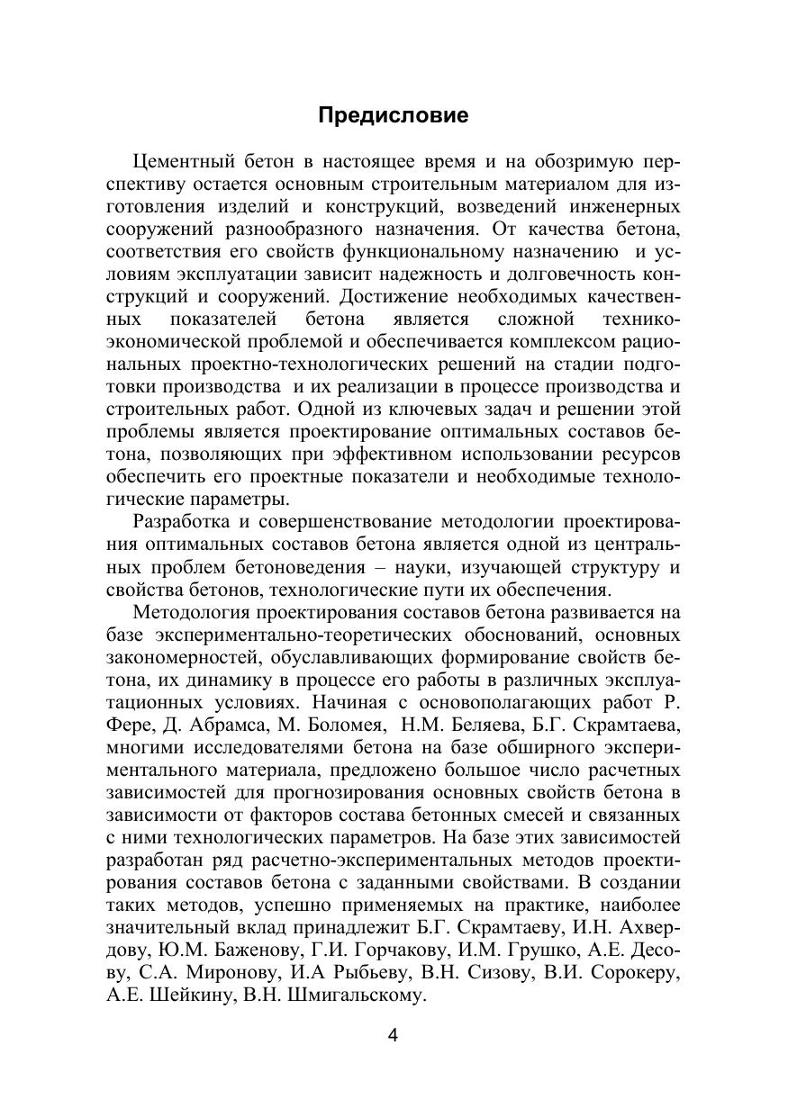 Излагаются основные расчетные методики прогнозирования основных свойств бетона на основе структурно-физических представлений и экспериментально-статистических моделей. Приведены основы методологии проектирования составов бетона с комплексом заданных проектных показателей. Рассмотрены алгоритмы и примеры решения задач проектирования составов бетона различных видов, а также их корректирования и адаптации в производственных условиях. Книга предназначена для инженерно-технических работников предприятий по изготовлению бетона и железобетонных изделий, а также строительных организаций. Книга может быть использована как пособие студентами и аспирантами строительных специальностей высших учебных заведений