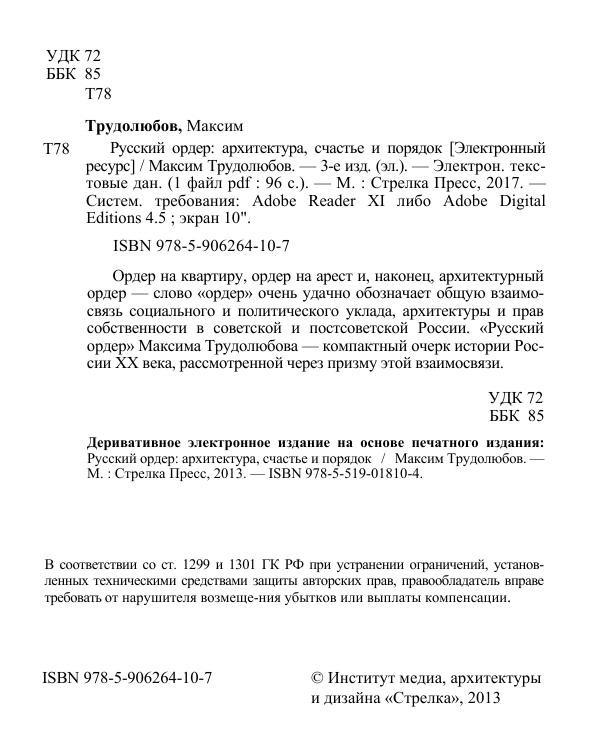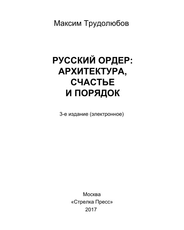 Ордер на квартиру, ордер на арест и, наконец, архитектурный ордер — слово «ордер» очень удачно обозначает общую взаимосвязь социального и политического уклада, архитектуры и прав собственности в советской и постсоветской России. «Русский ордер» Максима Трудолюбова — компактный очерк истории России XX века, рассмотренной через призму этой взаимосвязи.