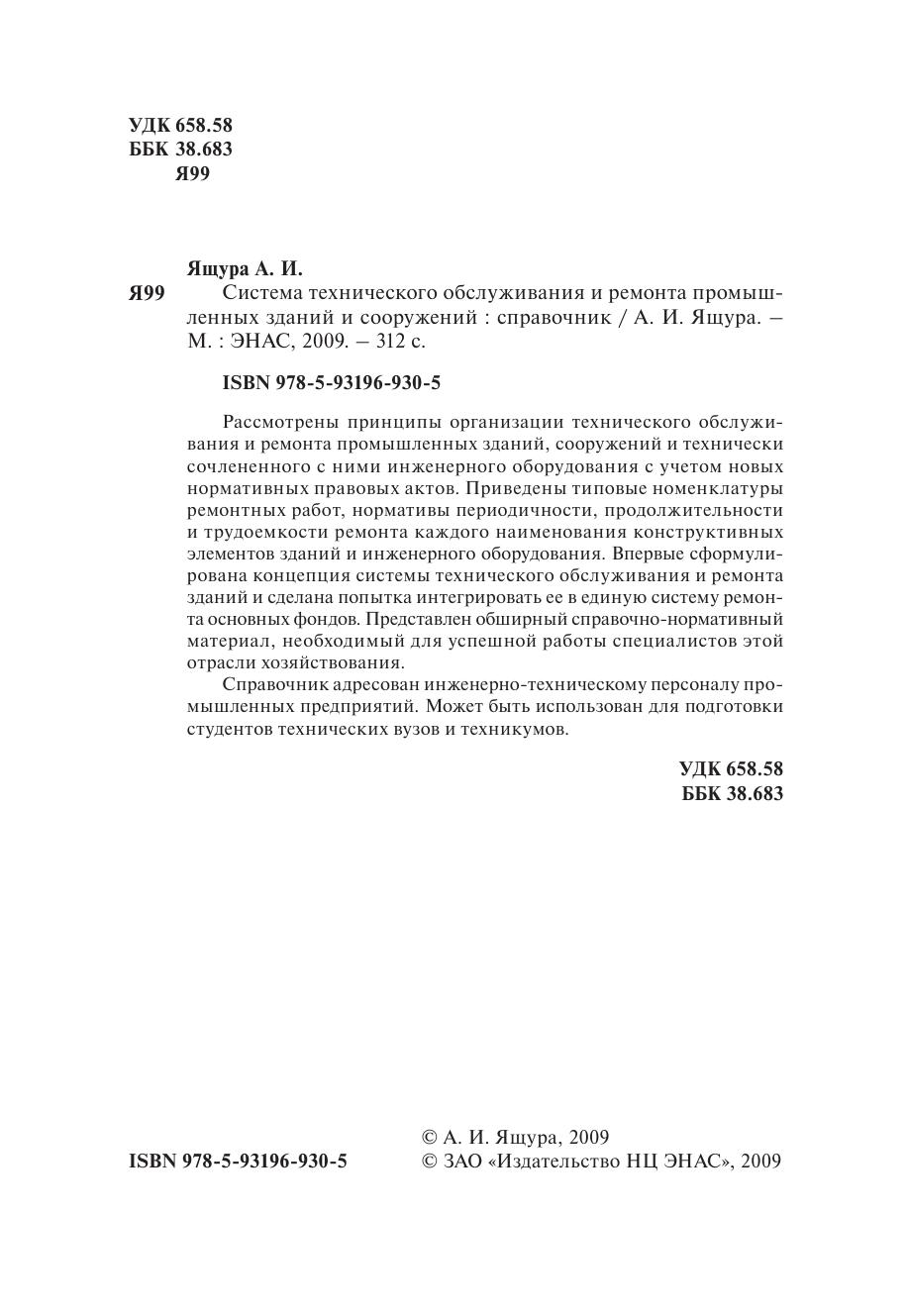 Рассмотрены принципы организации технического обслуживания и ремонта промышленных зданий, сооружений и технически сочлененного с ними инженерного оборудования с учетом новых нормативных правовых актов. Приведены типовые номенклатуры раемонтных работ, нормативы периодичности, продолжительности и трудоемкости ремонта каждого наименования конструктивных элементов зданий и инженерного оборудования. Впервые сформулирована концепция системы технического обслуживания и ремонта зданий исделана попытка интегрировать ее в единую систему ремонта основных фондов. Представлен обширный справочно-нормативный материал, необходимый для успешной работы специалистов этой отрасли хозяйствования.Справочник адресован инженерно-техническому персоналу промышленных прдприятий. Может быть использован для подготовки студентов технических вузов и техникумов.