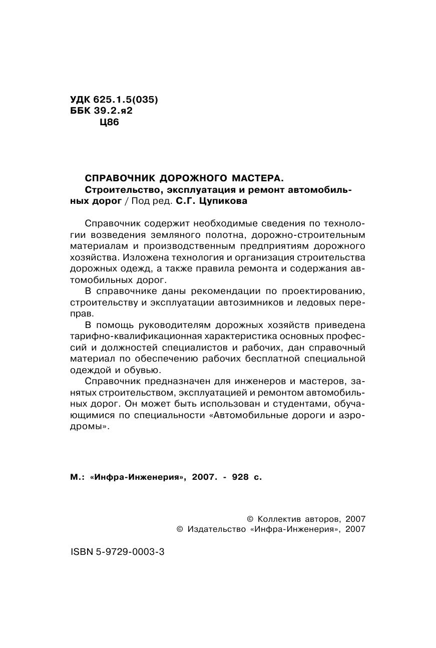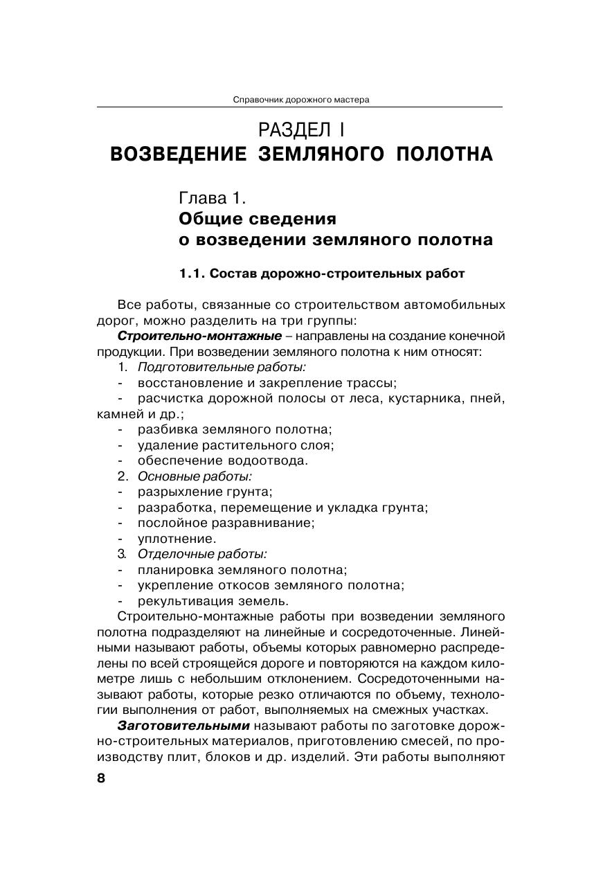 Справочник содержит необходимые сведения по технологии возведения земляного полотна, дорожно-строительным материалам и производственным предприятиям дорожного хозяйства. Изложена технология и организация строительства дорожных одежд, а также правила ремонта и содержания автомобильных дорог. В справочнике даны рекомендации по проектированию, строительству и эксплуатации автозимников и ледовых переправ. В помощь руководителям дорожных хозяйств приведена тарифно-квалификационная характеристика основных профессий и должностей специалистов и рабочих, дан справочный материал по обеспечению рабочих бесплатной специальной одеждой и обувью. Справочник предназначен для инженеров и мастеров, занятых строительством, эксплуатацией и ремонтом автомобильных дорог. Он может быть использован и студентами, обучающимися по специальности «Автомобильные дороги и аэродромы».