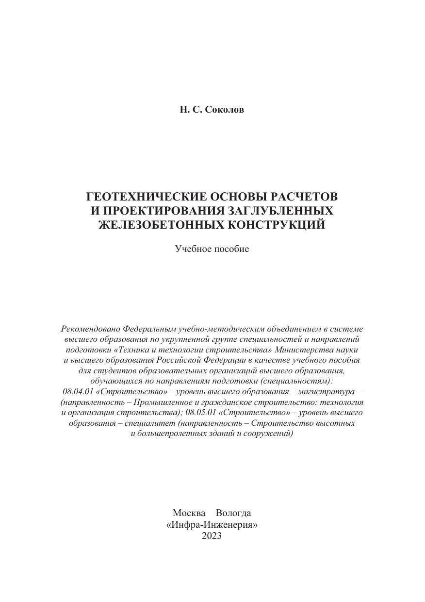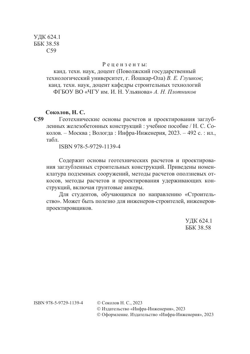 Содержит основы геотехнических расчетов и проектирования заглубленных строительных конструкций. Приведены номенклатура подземных сооружений, методы расчетов оползневых откосов, методы расчетов и проектирования удерживающих конструкций, включая грунтовые анкеры.