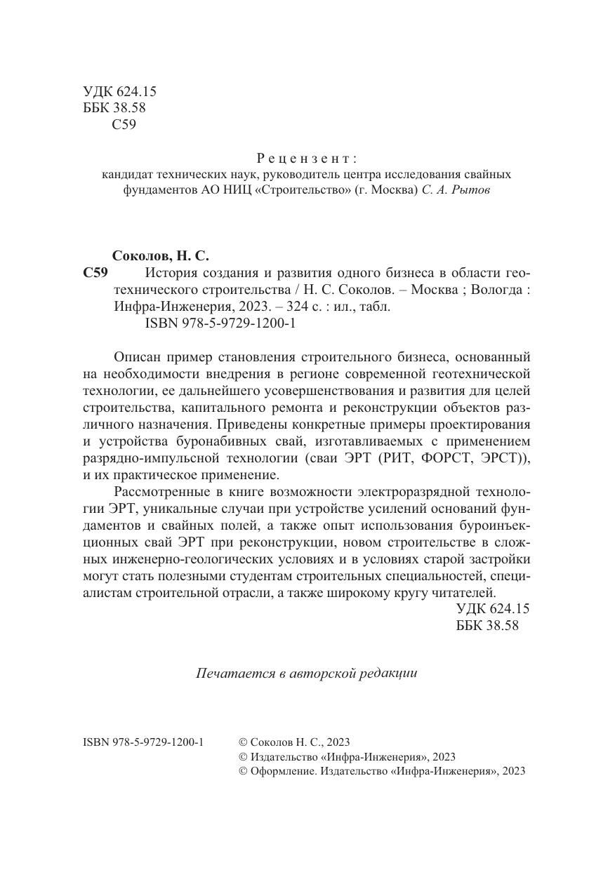Рассмотренные в книге возможности электроразрядной технологии ЭРТ, уникальные случаи при устройстве усилений оснований фундаментов и свайных полей, а также опыт использования буроинъекционных свай ЭРТ при реконструкции, новом строительстве в сложных инженерно-геологических условиях и в условиях старой застройки могут стать полезными студентам строительных специальностей, специалистам строительной отрасли, а также широкому кругу читателей.