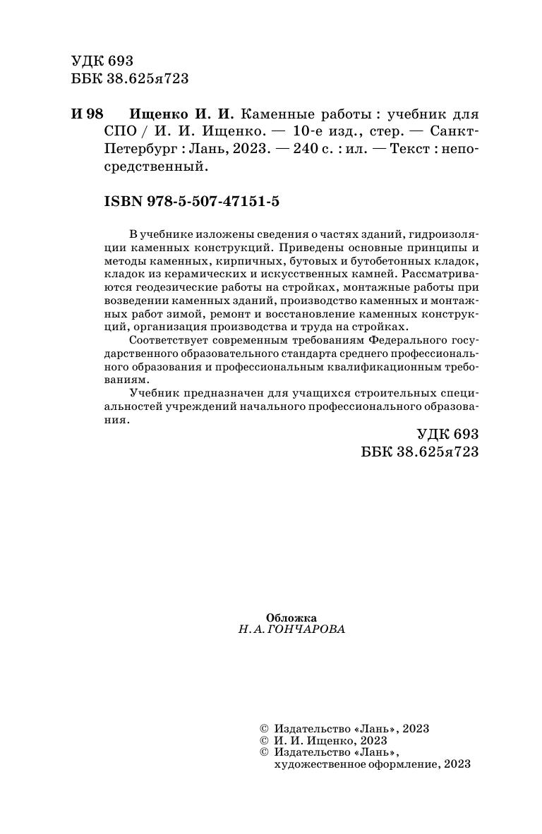 В учебнике изложены сведения о частях зданий, гидроизоляции каменных конструкций. Приведены основные принципы и методы каменных, кирпичных, бутовых и бутобетонных кладок, кладок из керамических и искусственных камней. Рассматриваются геодезические работы на стройках, монтажные работы при возведении каменных зданий, производство каменных и монтажных работ зимой, ремонт и восстановление каменных конструкций, организация производства и труда на стройках. Соответствует современным требованиям Федерального государственного образовательного стандарта среднего профессионального образования и профессиональным квалификационным требованиям. Учебник предназначен для учащихся строительных специальностей учреждений начального профессионального образования.