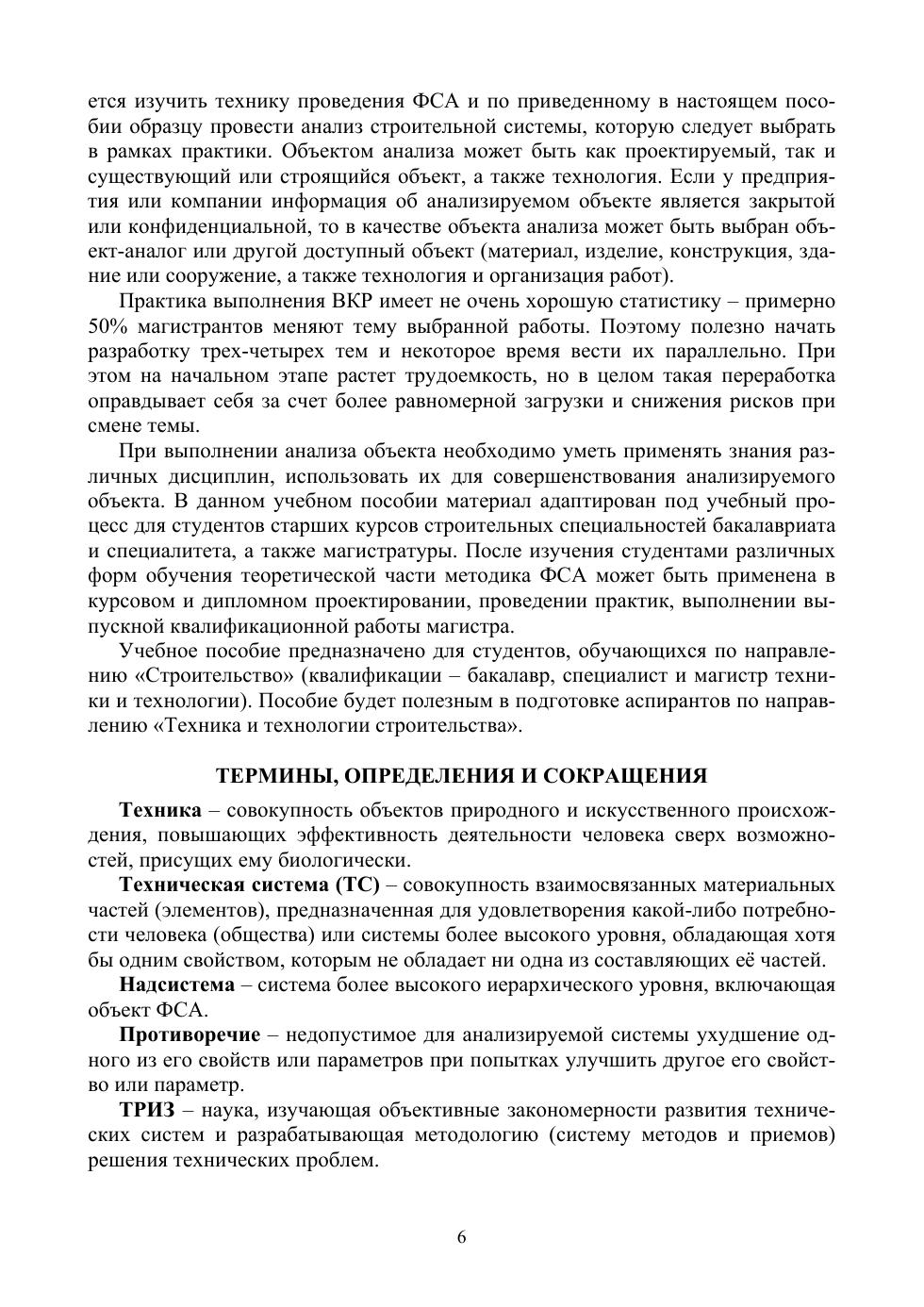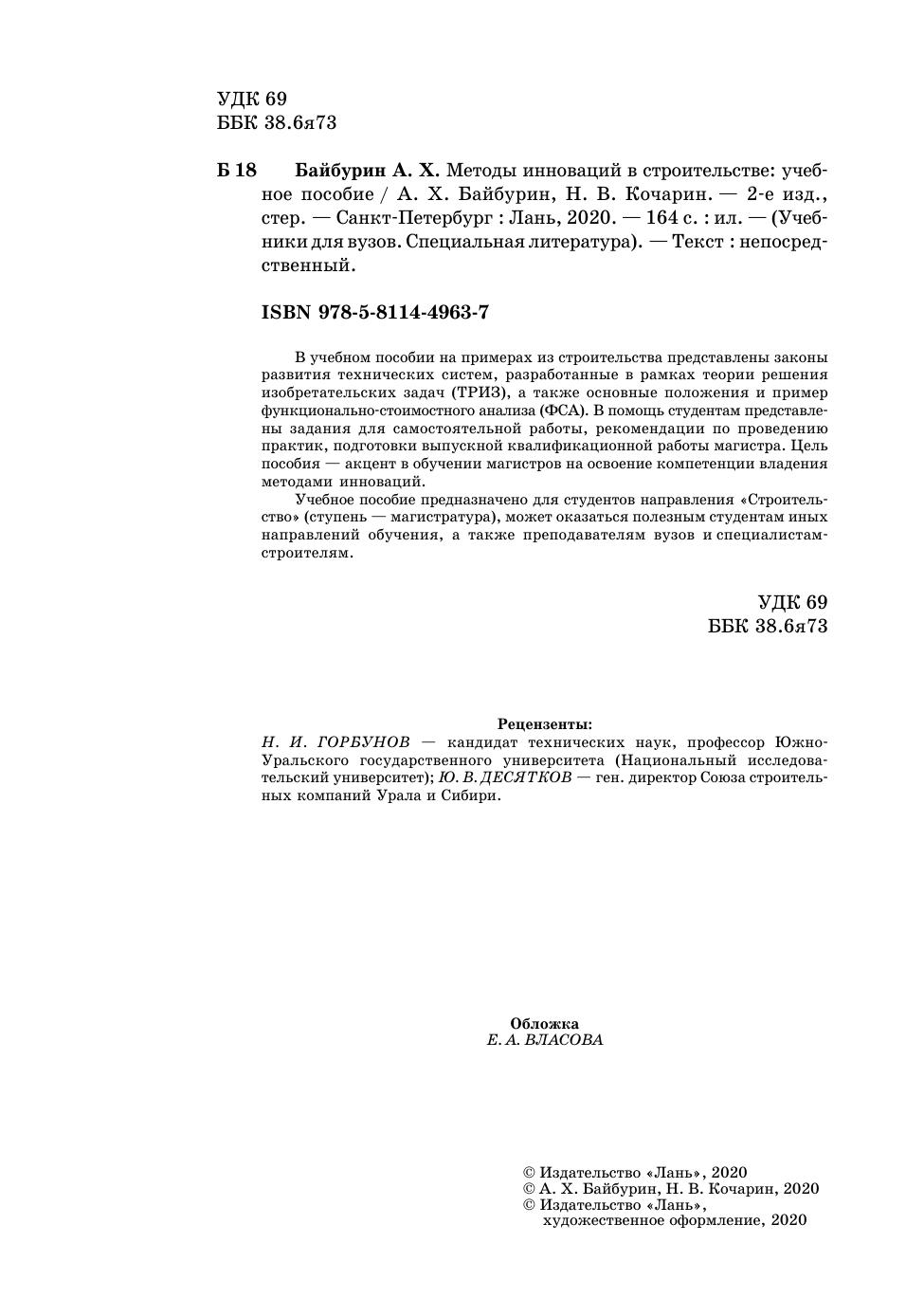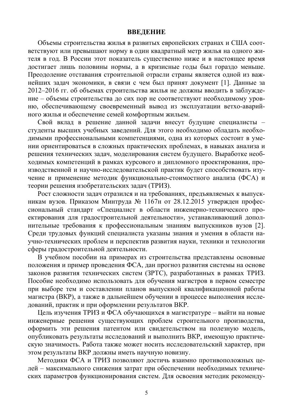 В учебном пособии на примерах из строительства представлены законы развития технических систем, разработанные в рамках теории решения изобретательских задач (ТРИЗ), а также основные положения и пример функционально-стоимостного анализа (ФСА). В помощь студентам представлены задания для самостоятельной работы, рекомендации по проведению практик, подготовки выпускной квалификационной работы магистра. Цель пособия — акцент в обучении магистров на освоение компетенции владения методами инноваций.