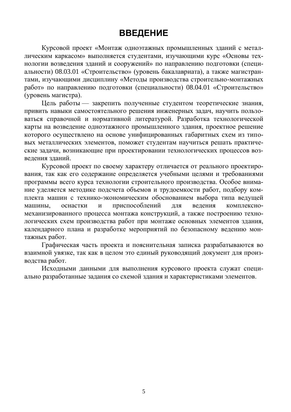 Представлены теоретические учебные материалы по строительству одноэтажных каркасно-панельных промышленных зданий, возводимых путем монтажа элементов стального каркаса, кровельных конструкций из профилированного стального настила и легких стеновых панелей типа «сэндвич» стреловыми самоходными кранами. Даны рекомендации к выполнению курсового проекта и раздела выпускной квалификационной работы по разработке технологической карты на возведение одноэтажных каркасно-панельных промышленных зданий из металлических элементов, кровельных конструкций с профилированным стальным настилом и легких стеновых панелей типа «сэндвич». Приводятся методики подсчета объемов работ, трудозатрат, выбора основных машин, оснастки и приспособлений, а также технико-экономическое обоснование принятого варианта производства работ и мероприятия по вопросам охраны труда. Учебное пособие предназначено для студентов всех форм обучения, обучающихся по направлению подготовки «Строительство» (бакалавриат), изучающих дисциплины «Основы технологии возведения зданий и сооружений», «Строительство» (магистратура), изучающих дисциплину «Методы производства строительно-монтажных работ».