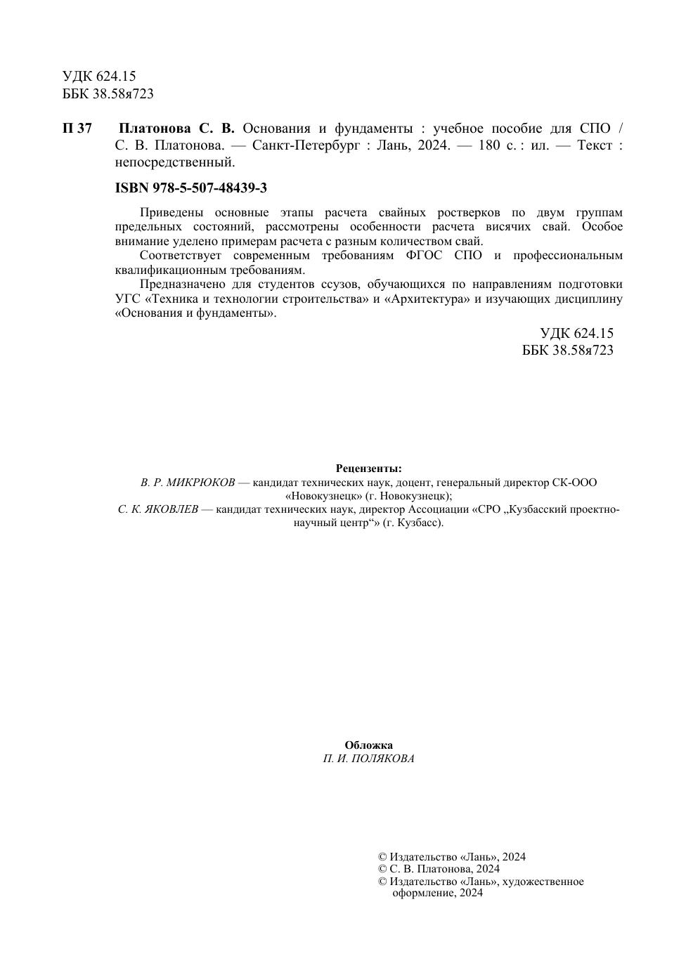 Приведены основные этапы расчета свайных ростверков по двум группам предельных состояний, рассмотрены особенности расчета висячих свай. Особое внимание уделено примерам расчета с разным количеством свай. Соответствует современным требованиям ФГОС СПО и профессиональным квалификационным требованиям. Предназначено для студентов ссузов, обучающихся по направлениям подготовки УГС «Техника и технологии строительства» и «Архитектура» и изучающих дисциплину «Основания и фундаменты».