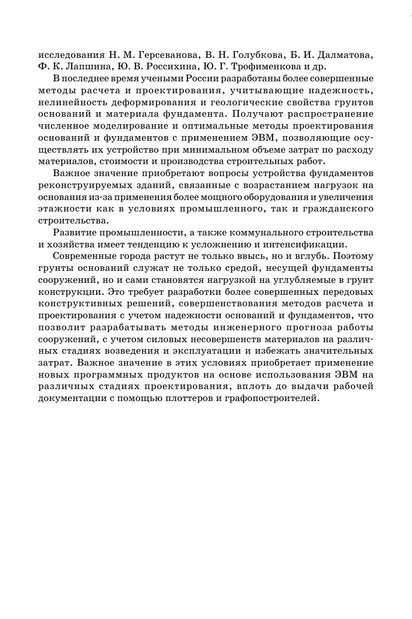 В книге приведены методы и примеры расчета оснований и фундаментов по предельным состояниям первой и второй групп. Рассмотрены фундаменты различных типов: для открытых котлованов, свайные, глубокого заложения, на структурно-неустойчивых грунтах. Даны сведения по реконструкции фундаментов зданий и сооружений. Приводятся основные положения правил конструирования фундаментов. Учебник предназначен для студентов средних профессиональных учебных заведений, обучающихся по специальностям «Строительство и эксплуатация зданий и сооружений», «Строительство и эксплуатация инженерных сооружений», «Строительство и эксплуатация автомобильных дорог и аэродромов». Соответствует современным требованиям Федерального государственного образовательного стандарта среднего профессионального образования и профессиональным квалификационным требованиям.