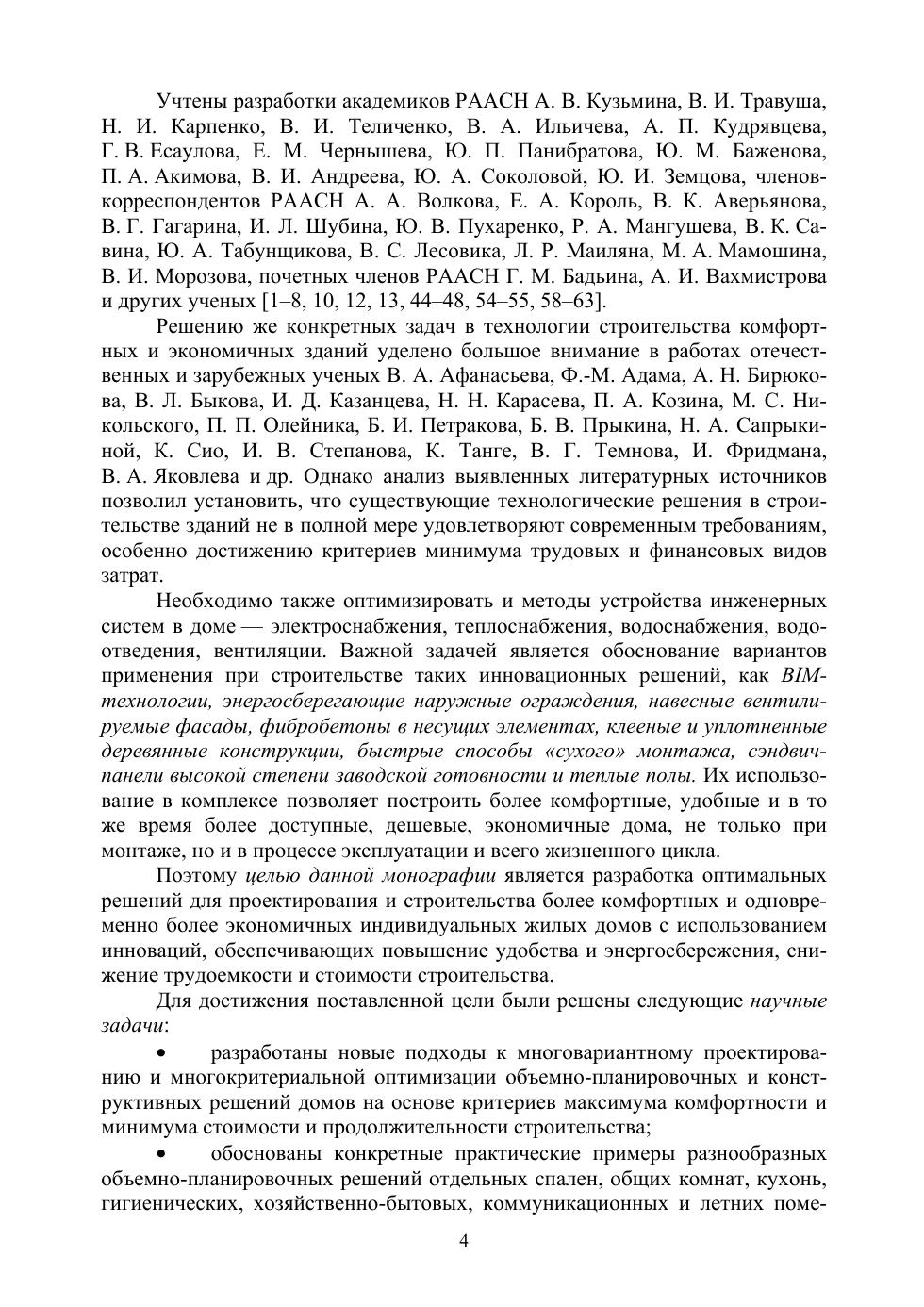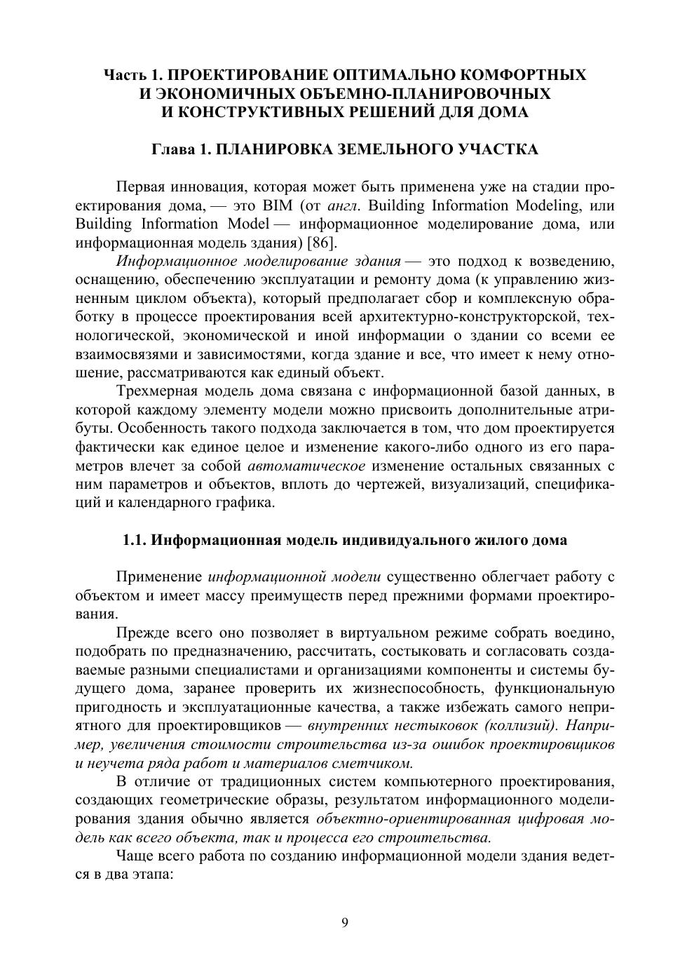 Представлены современные российские инновационные комплексные подходы к проектированию и строительству индивидуальных жилых домов. Рассмотрены многовариантное проектирование и многокритериальная оптимизация объемно-планировочных и конструктивных решений на основе максимальной комфортности и минимальных стоимости и продолжительности строительства. Изложены базовые научно обоснованные технологии возведения домов: кирпичная кладка, монолитное бетонирование, монтаж каменных блоков, устройство деревянных конструкций, монтаж быстровозводимых сэндвич-панелей. Раскрыты методы оптимального устройства домовых инженерных систем (электро-, тепло- и водоснабжения, водоотведения, вентиляции).