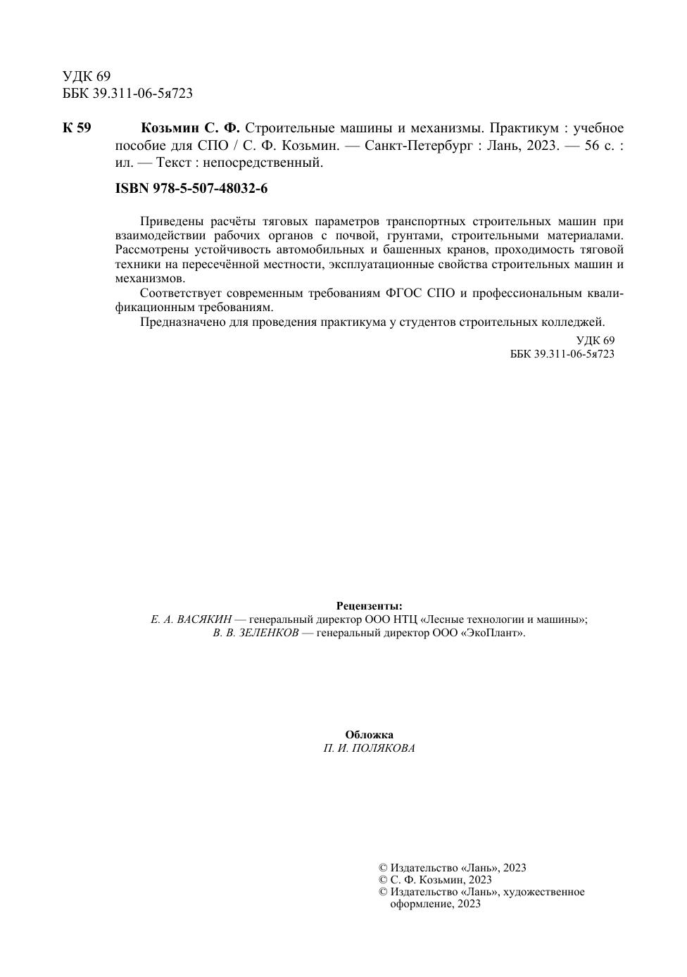 Приведены расчёты тяговых параметров транспортных строительных машин при взаимодействии рабочих органов с почвой, грунтами, строительными материалами. Рассмотрены устойчивость автомобильных и башенных кранов, проходимость тяговой техники на пересечённой местности, эксплуатационные свойства строительных машин и механизмов. Соответствует современным требованиям ФГОС СПО и профессиональным квалификационным требованиям. Предназначено для проведения практикума у студентов строительных колледжей