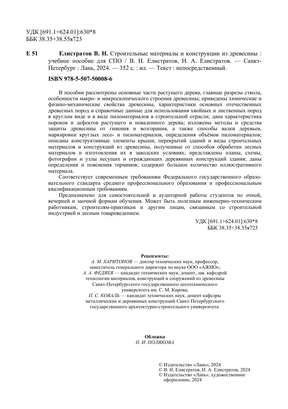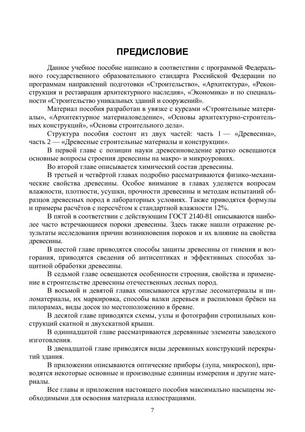 В пособии рассмотрены основные части растущего дерева, главные разрезы ствола, особенности макро- и микроскопического строения древесины, приведены химические и физико-механические свойства древесины, характеристики основных отечественных древесных пород и справочные данные для использования хвойных и лиственных пород в круглом виде и в виде пиломатериалов в строительной отрасли, дана характеристика пороков и дефектов растущего и поваленного дерева, изложены методы и средства защиты древесины от гниения и возгорания, а также способы валки деревьев, маркировки круглых лесо- и пиломатериалов, определения объёмов пиломатериалов, описаны конструктивные элементы крыши, перекрытий зданий и виды строительных материалов и конструкций из древесины, полученные от способов обработки лесных материалов и изготовления их в заводских условиях, представлены планы, схемы, фотографии и узлы несущих и ограждающих деревянных конструкций здания, даны определения и пояснения терминов, содержит большое количество иллюстративного материала. Соответствует современным требованиям Федерального государственного образовательного стандарта среднего профессионального образования и профессиональным квалификационным требованиям. Предназначено для самостоятельной и аудиторной работы студентов по очной, вечерней и заочной формам обучения. Может быть полезным инженерно-техническим работникам, строителям-практикам и другим лицам, связанным со строительной индустрией и лесным товароведением.