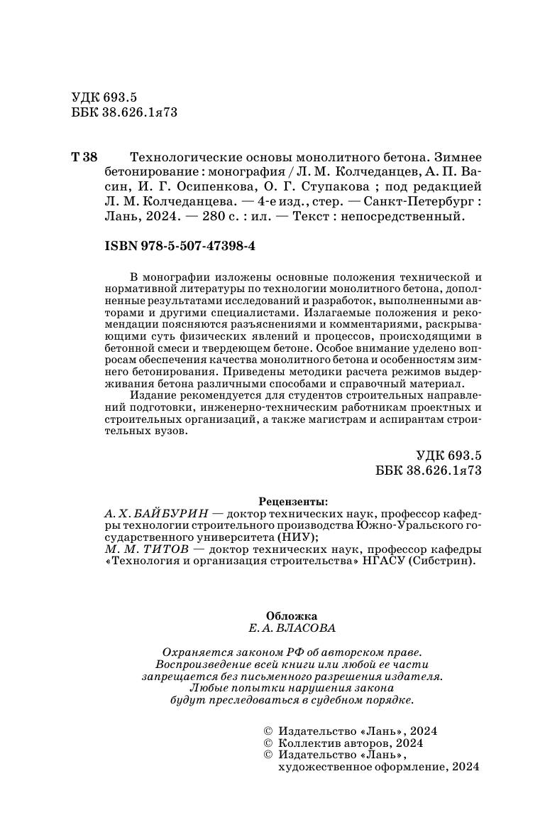 В монографии изложены основные положения технической и нормативной литературы по технологии монолитного бетона, дополненные результатами исследований и разработок, выполненными авторами и другими специалистами. Излагаемые положения и рекомендации поясняются разъяснениями и комментариями, раскрывающими суть физических явлений и процессов, происходящими в бетонной смеси и твердеющем бетоне. Особое внимание уделено вопросам обеспечения качества монолитного бетона и особенностям зимнего бетонирования. Приведены методики расчета режимов выдерживания бетона различными способами и справочный материал. Издание рекомендуется для студентов строительных направлений подготовки, инженерно-техническим работникам проектных и строительных организаций, а также магистрам и аспирантам строительных вузов.