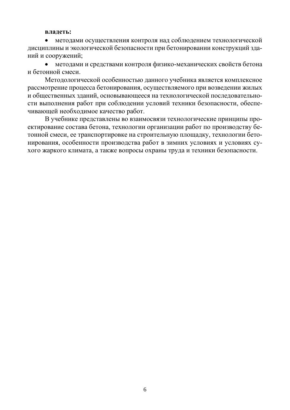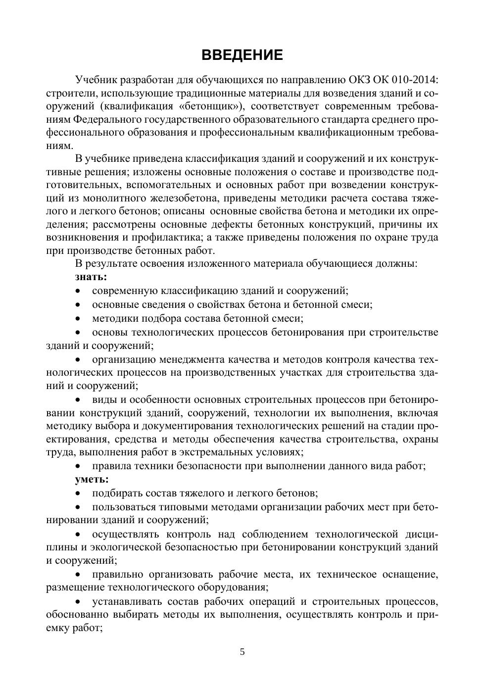 Учебник разработан для обучающихся по направлению ОКЗ ОК 010-2014: строители, использующие традиционные материалы для возведения зданий и сооружений (квалификация «бетонщик»), соответствует современным требованиям Федерального государственного образовательного стандарта среднего профессионального образования и профессиональным квалификационным требованиям. В учебнике приведена классификация зданий и сооружений и их конструктивные решения, изложены основные положения о составе и производстве подготовительных, вспомогательных и основных работ при возведении конструкций из монолитного железобетона, приведены методики расчета состава тяжелого и легкого бетонов, описаны основные свойства бетона и методики их определения, рассмотрены основные дефекты бетонных конструкций, причины их возникновения и профилактика, а также приведены положения по охране труда при производстве бетонных работ.