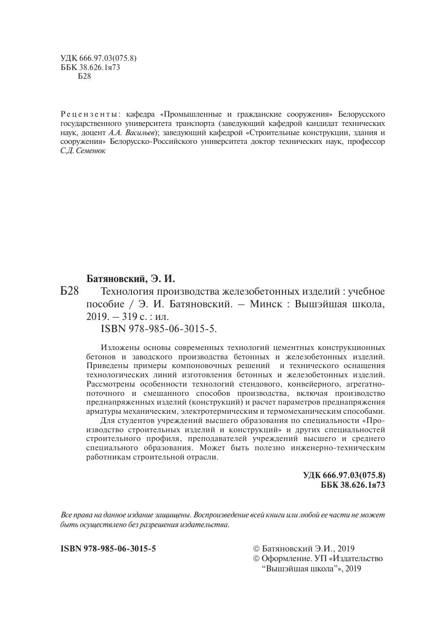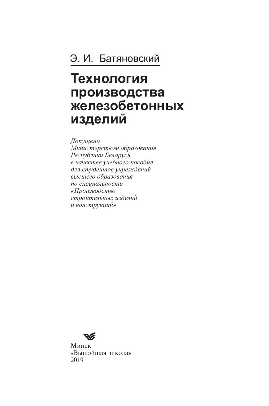 Изложены основы современных технологий цементных конструкционных бетонов и заводского производства бетонных и железобетонных изделий. Приведены примеры компоновочных решений и технического оснащения технологических линий изготовления бетонных и железобетонных изделий. Рассмотрены особенности технологий стендового, конвейерного, агрегатно-поточного и смешанного способов производства, включая производство преднапряженных изделий (конструкций) и расчет параметров преднапряжения арматуры механическим, электротермическим и термомеханическим способами. Для студентов учреждений высшего образования по специальности «Производство строительных изделий и конструкций» и других специальностей строительного профиля, преподавателей учреждений высшего и среднего специального образования. Может быть полезно инженерно-техническим работникам строительной отрасли.