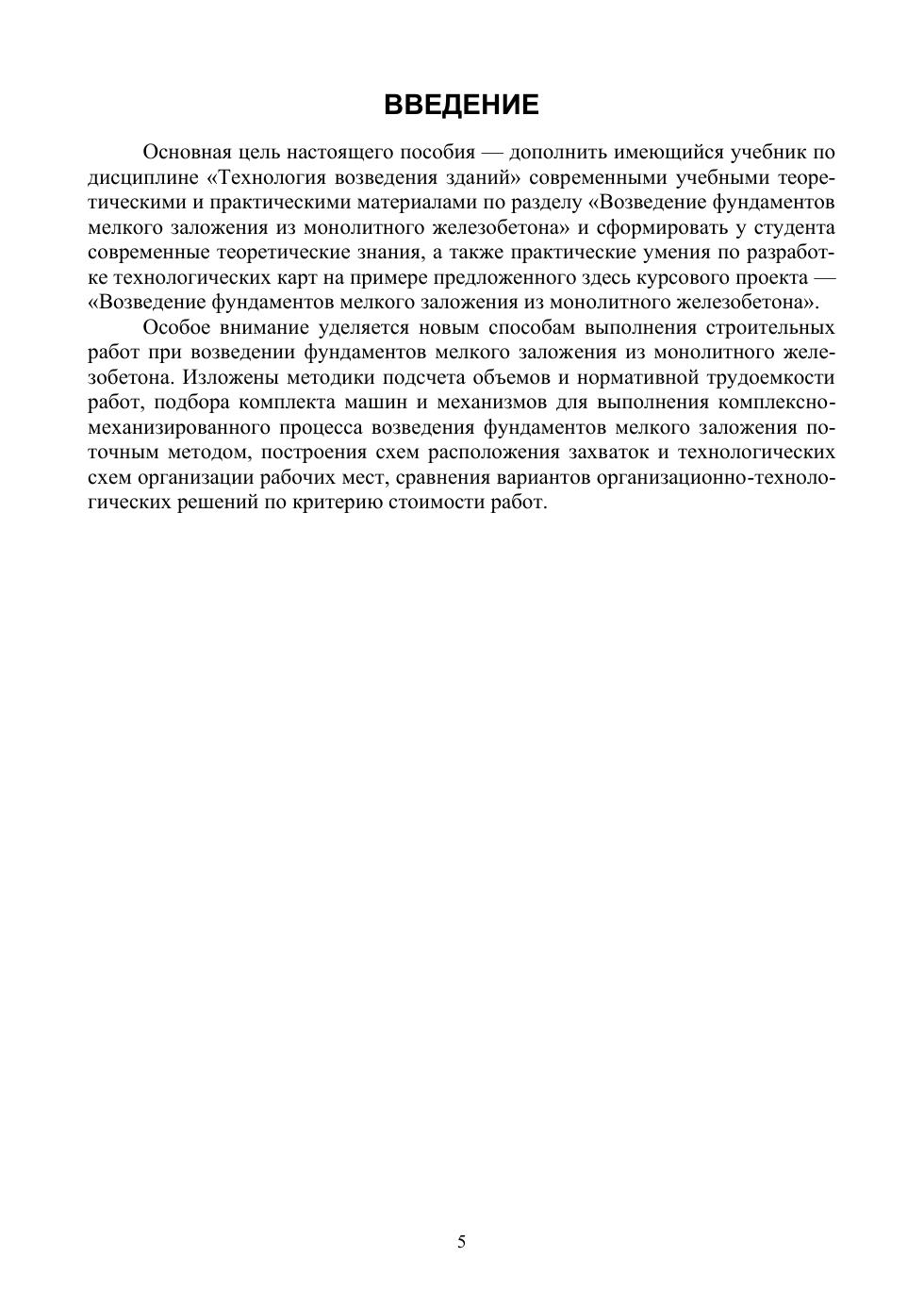 Представлены современные теоретические и практические материалы по разделу «Возведение фундаментов мелкого заложения из монолитного железобетона» дисциплины «Технология возведения зданий». Рассмотрена последовательность разработки технологических карт на примере выполнения курсового проекта «Возведение фундаментов мелкого заложения из монолитного железобетона». Изложена методика подсчета объемов работ, выбора основных машин и механизмов для производства работ. Приводятся методики подсчета нормативной трудоемкости работ и формирования частных строительных потоков с учетом разбивки здания на захватки, а комплексного процесса – на простые процессы. Дана методика определения численного и квалификационного состава бригад частных потоков и разработки графика работ. Отражены вопросы охраны труда при производстве работ по возведению фундаментов мелкого заложения. Предложены вопросы для контроля знаний студентов. Пособие предназначено для студентов, обучающихся по направлению «Строительство» всех форм обучения.