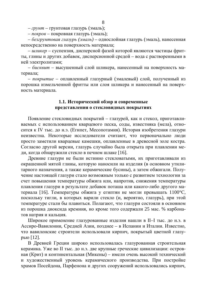 В учебном пособии даются общие понятия стекловидных покрытий, приводится краткий исторический обзор и современные представления о них. Рассматривается технология нанесения покрытий с помощью плазменного напыления. Авторы приводят классификацию стекловидных покрытий, основные требования, предъявляемые к глазурям для обжиговых и безобжиговых материалов. Отдельно рассматриваются вопросы глазурования керамики, декорирования стекла и отделки стекловидными покрытиями искусственных каменных безобжиговых материалов. Характеризуются дефекты глазурования и способы их предотвращения. Рассматриваются также способы металлизации и нанесения декоративных полимерных покрытий на поверхности строительных материалов и изделий. Учебное пособие предназначено для студентов средних профессиональных учебных заведений, обучающихся по специальности «Строительство и эксплуатация зданий и сооружений».