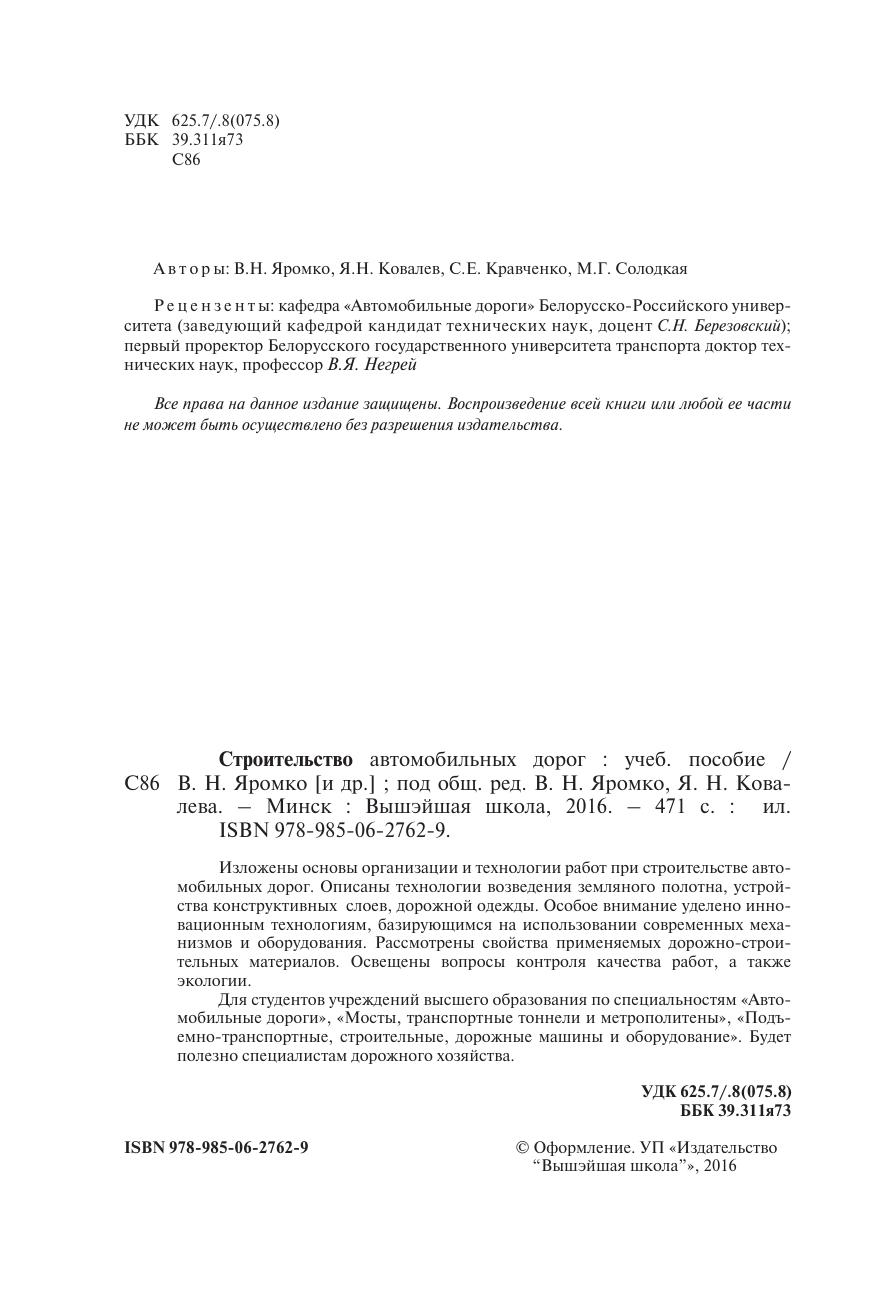 Изложены основы организации и технологии работ при строительстве автомобильных дорог. Описаны технологии возведения земляного полотна, устройства конструктивных слоев, дорожной одежды. Особое внимание уделено инновационным технологиям, базирующимся на использовании современных механизмов и оборудования. Рассмотрены свойства применяемых дорожно-строительных материалов. Освещены вопросы контроля качества работ, а также экологии. Для студентов учреждений высшего образования по специальностям «Автомобильные дороги», «Мосты, транспортные тоннели и метрополитены», «Подъемно-транспортные, строительные, дорожные машины и оборудование». Будет полезно специалистам дорожного хозяйства.