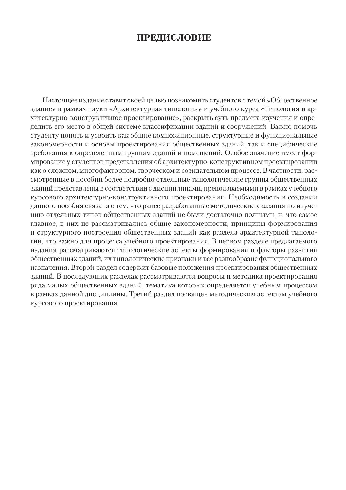 В учебном пособии приведены основные положения теории и практики проектирования общественных зданий, показаны особенности их объемно-планировочных, композиционных и архитектурно-конструктивных решений, дан общий алгоритм структурирования общественного здания как целостного архитектурного объекта. Пособие имеет практико-ориентированный характер. Помимо теоретического материала, даны методические рекомендации по изучению дисциплины «Типология и архитектурно-конструктивное проектирование» и показаны требования по выполнению курсовых и дипломных проектов. Рекомендуется студентам всех форм обучения для проведения практических занятий, выполнения курсовых и дипломных проектов, а также для подготовки к аттестации.