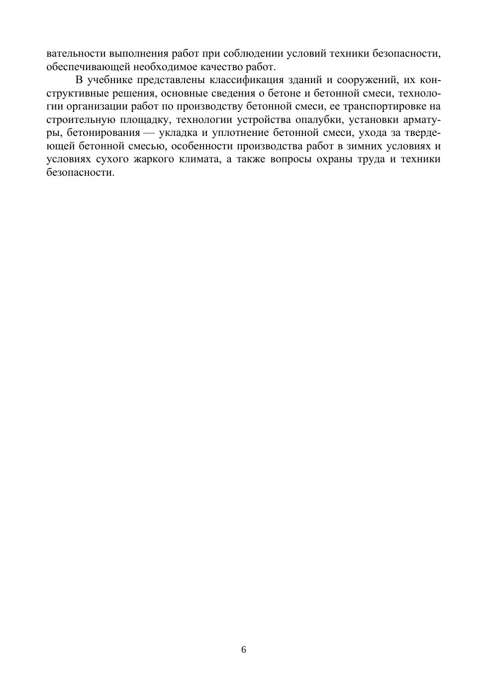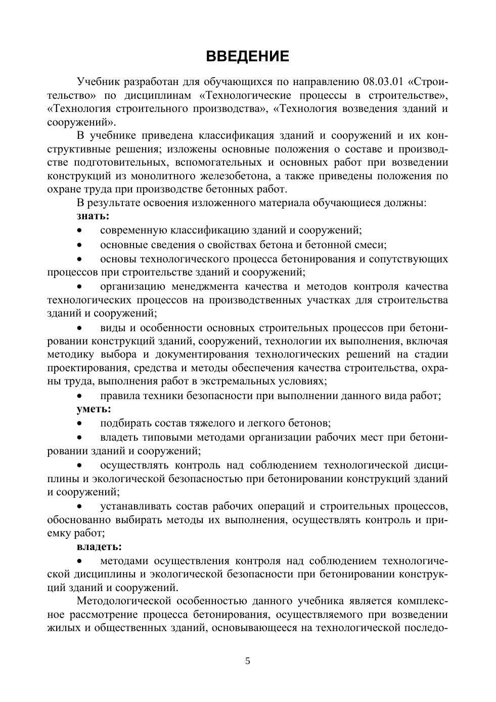 Учебник разработан для обучающихся по направлению «Строительство» по дисциплинам «Технологические процессы в строительстве», «Технология строительного производства», «Технология возведения зданий и сооружений». В учебнике приведена классификация зданий и сооружений и их конструктивные решения, изложены основные положения о составе и производстве подготовительных, вспомогательных и основных работ при возведении конструкций из монолитного железобетона, а также приведены положения по охране труда при производстве бетонных работ.