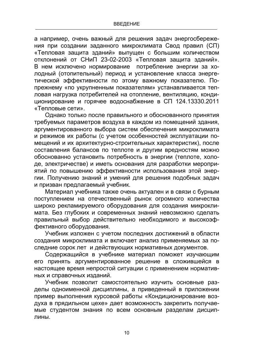 Рассмотрены системы создания технологического и комфортного микроклимата (системы кондиционирования, вентиляции и отопления) с учетом принципов энергосбережения. Большое внимание обращается на обоснованное принятие параметров воздуха в помещениях различного назначения и на теплозащитные свойства ограждающих конструкций этих помещений. Даны рекомендации и примеры выбора оборудования для поддержания необходимого микроклимата с учетом действующих нормативных документов и разработок авторов.