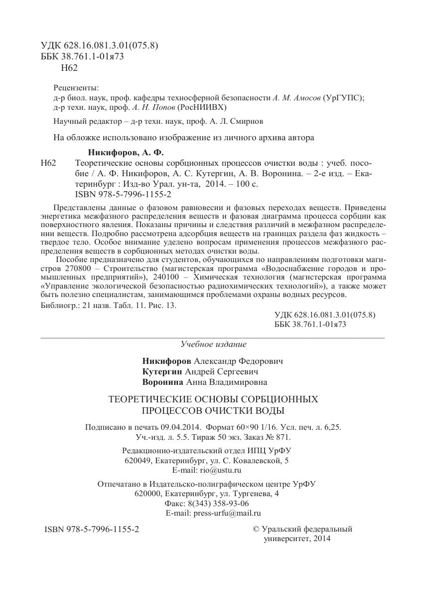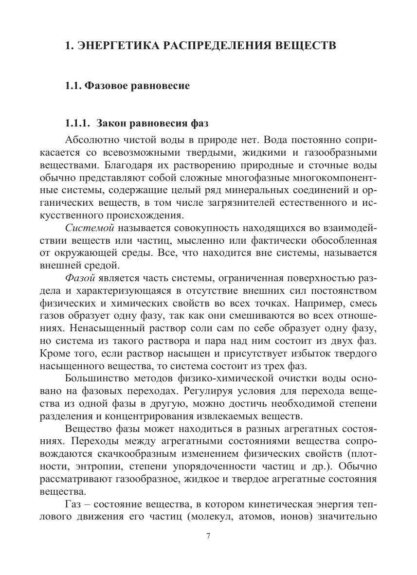 Представлены данные о фазовом равновесии и фазовых переходах веществ. Приведены энергетика межфазного распределения веществ и фазовая диаграмма процесса сорбции как поверхностного явления. Показаны причины и следствия различий в межфазном распределении веществ. Подробно рассмотрена адсорбция веществ на границах раздела фаз жидкость – твердое тело. Особое внимание уделено вопросам применения процессов межфазного распределения веществ в сорбционных методах очистки воды. Пособие предназначено для студентов, обучающихся по направлениям подготовки магистров 270800 – Строительство (магистерская программа «Водоснабжение городов и промышленных предприятий»), 240100 – Химическая технология (магистерская программа «Управление экологической безопасностью радиохимических технологий»), а также может быть полезно специалистам, занимающимся проблемами охраны водных ресурсов.