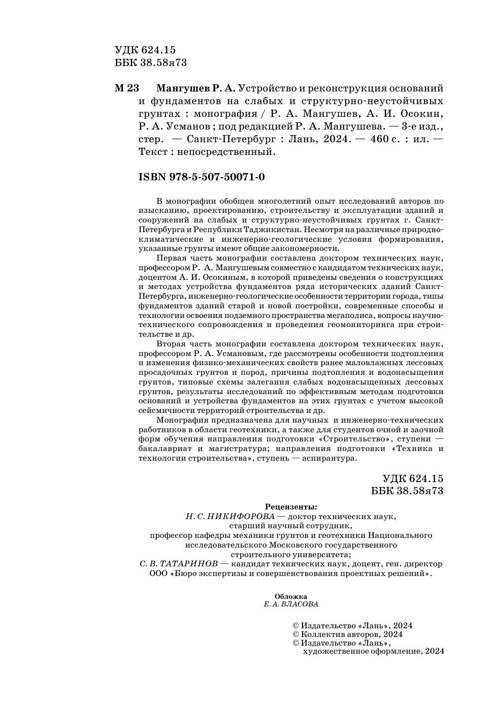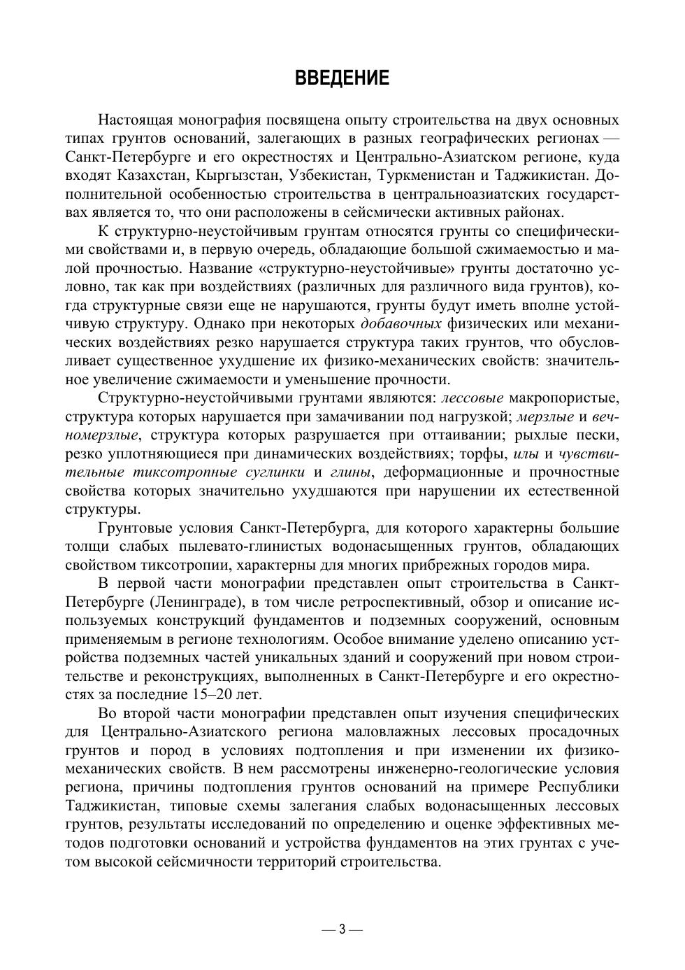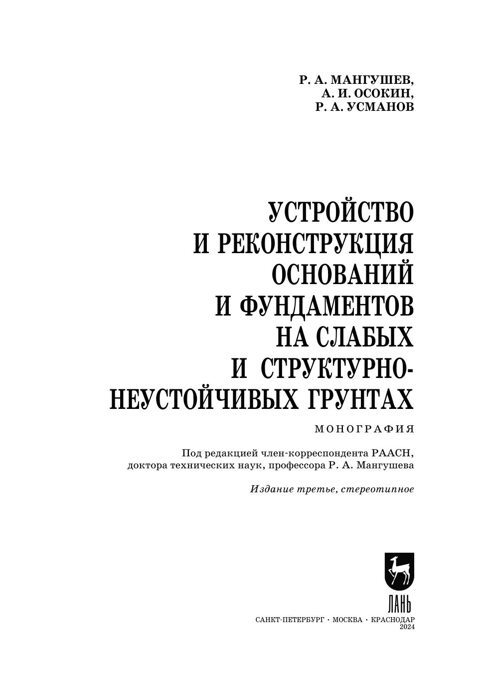 В монографии обобщен многолетний опыт исследований авторов по изысканию, проектированию, строительству и эксплуатации зданий и сооружений на слабых и структурно-неустойчивых грунтах г. Санкт-Петербурга и Республики Таджикистан. Несмотря на различные природно-климатические и инженерно-геологические условия формирования, указанные грунты имеют общие закономерности (характеризуются низкой несущей способностью, R ≤ 100 кПа, высокой сжимаемостью, Е ≤ 5 МПа, длительным протеканием осадок во времени, высоким расположением уровня подземных вод и др.). Первая часть монографии составлена д. т. н., проф. Р. А. Мангушевым совместно c к. т. н., доцентом А. И. Осокиным, в ней приведены сведения о конструкциях и методах устройства фундаментов ряда исторических зданий Санкт-Петербурга, инженерно-геологические особенности территории города, типы фундаментов зданий старой и новой постройки, современные способы и технологии освоения подземного пространства мегаполиса, вопросы научно-технического сопровождения и проведения геомониторинга при строительстве и др. Вторая часть монографии составлена д. т. н., проф. Р. А. Усмановым, здесь рассмотрены особенности подтопления и изменения физико-механических свойств раннее маловлажных лессовых просадочных грунтов и пород, причины подтопления и водонасыщения грунтов, типовые схемы залегания слабых водонасыщнных лессовых грунтов, результаты исследований по эффективным методам подготовки оснований и устройства фундаментов на этих грунтах с учетом высокой сейсмичности территорий строительства и др.