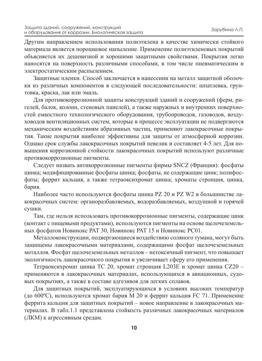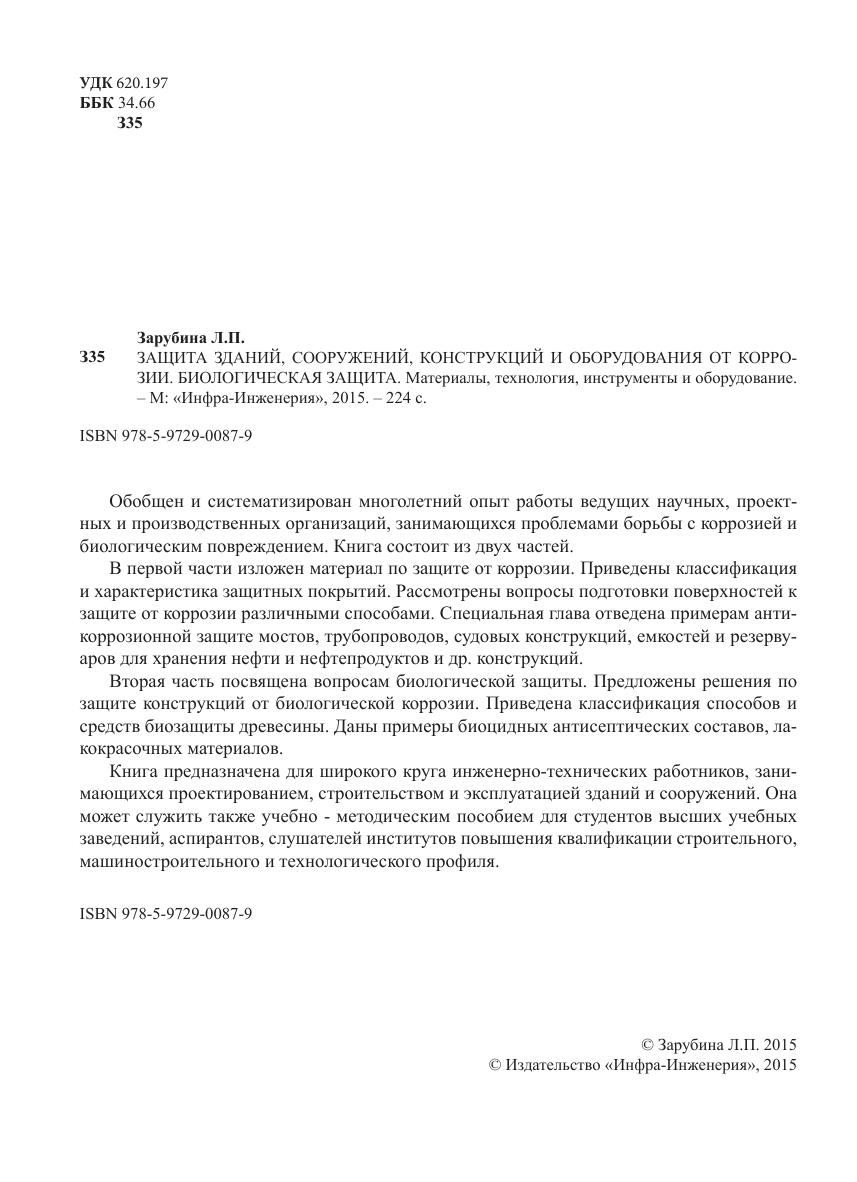 Обобщен и систематизирован многолетний опыт работы ведущих научных, проектных и производственных организаций, занимающихся проблемами борьбы с коррозией и биологическим повреждением. Книга состоит из двух частей. В первой части изложен материал по защите от коррозии. Приведены классификация и характеристика защитных покрытий. Рассмотрены вопросы подготовки поверхностей к защите от коррозии различными способами. Специальная глава отведена примерам анти-коррозионной защите мостов, трубопроводов, судовых конструкций, емкостей и резервуаров для хранения нефти и нефтепродуктов и др. конструкций. Вторая часть посвящена вопросам биологической защиты. Предложены решения по защите конструкций от биологической коррозии. Приведена классификация способов и средств биозащиты древесины. Даны примеры биоцидных антисептических составов, лакокрасочных материалов. Книга предназначена для широкого круга инженерно-технических работников, занимающихся проектированием, строительством и эксплуатацией зданий и сооружений. Она может служить также учебно - методическим пособием для студентов высших учебных заведений, аспирантов, слушателей институтов повышения квалификации строительного, машиностроительного и технологического профиля