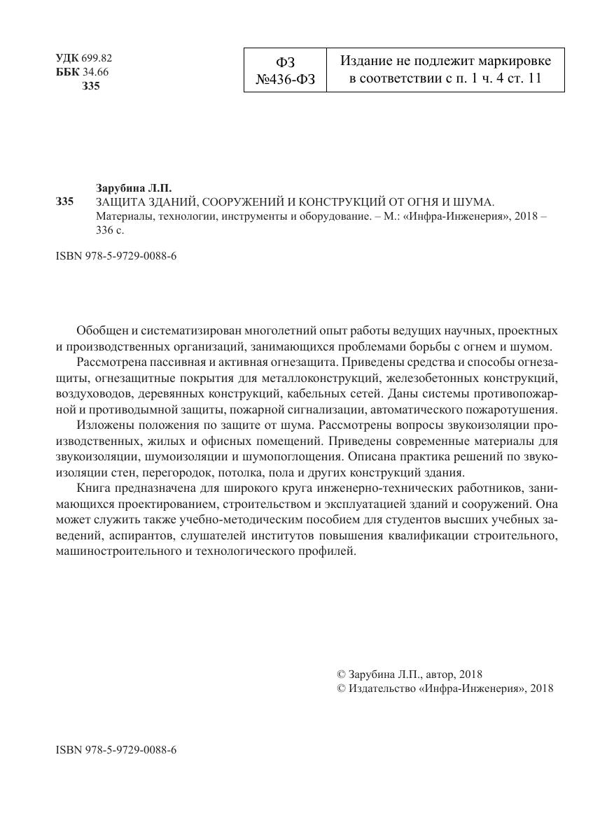 Обобщен и систематизирован многолетний опыт работы ведущих научных, проектных и производственных организаций, занимающихся проблемами борьбы с огнем и шумом. Рассмотрена пассивная и активная огнезащита. Приведены средства и способы огнезащиты, огнезащитные покрытия для металлоконструкций, железобетонных конструкций, воздуховодов, деревянных конструкций, кабельных сетей. Даны системы противопожарной и противодымной защиты, пожарной сигнализации, автоматического пожаротушения. Изложены положения по защите от шума. Рассмотрены вопросы звукоизоляции производственных, жилых и офисных помещений. Приведены современные материалы для звукоизоляции, шумоизоляции и шумопоглощения. Описана практика решений по звукоизоляции стен, перегородок, потолка, пола и других конструкций здания.