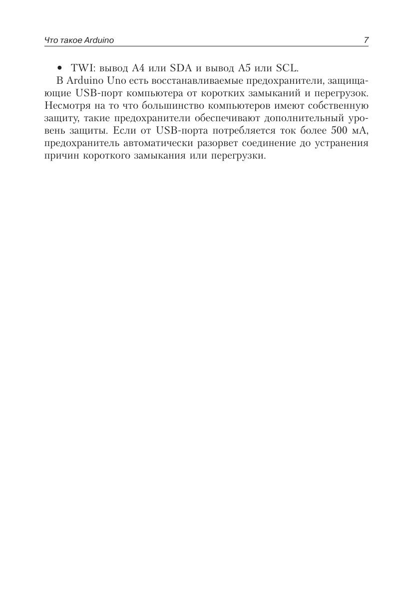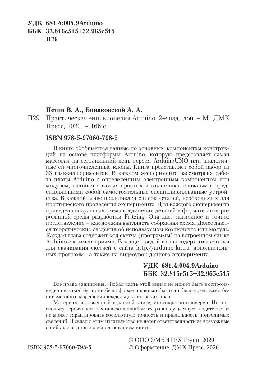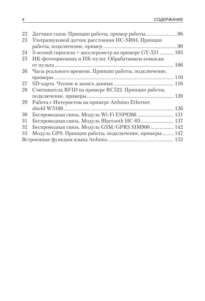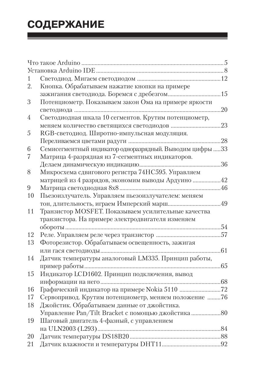 Книга представляет собой набор из 33 глав-экспериментов. В каждом эксперименте рассмотрена работа платы Arduino c определенным электронным компонентом или модулем, начиная с самых простых и заканчивая сложными, представляющими собой самостоятельные специализированные устройства. В каждой главе представлен список деталей, необходимых для практического проведения эксперимента. Для каждого эксперимента приведена визуальная схема соединения деталей в формате интегрированной среды разработки Fritzing. Она дает наглядное и точноепредставление, как должна выглядеть схема.