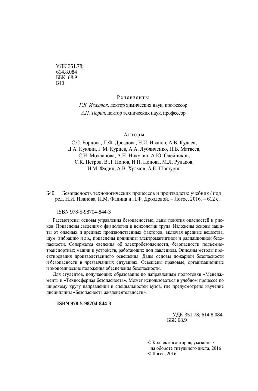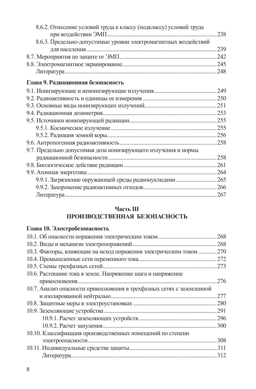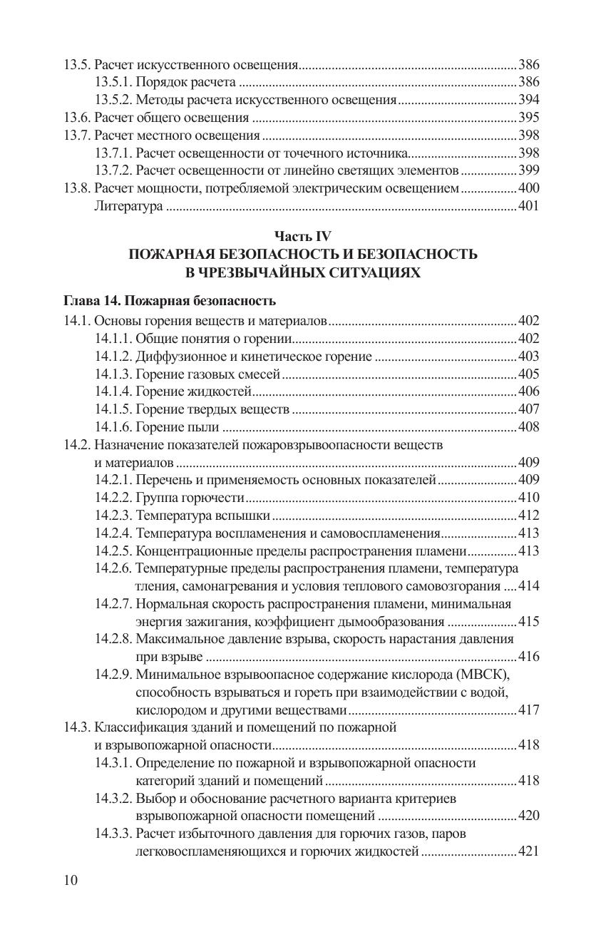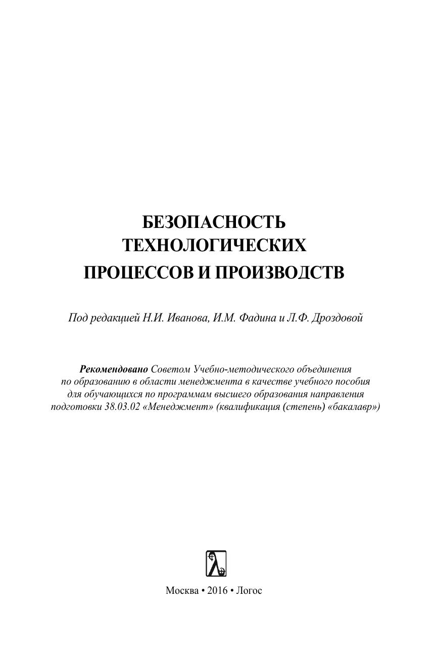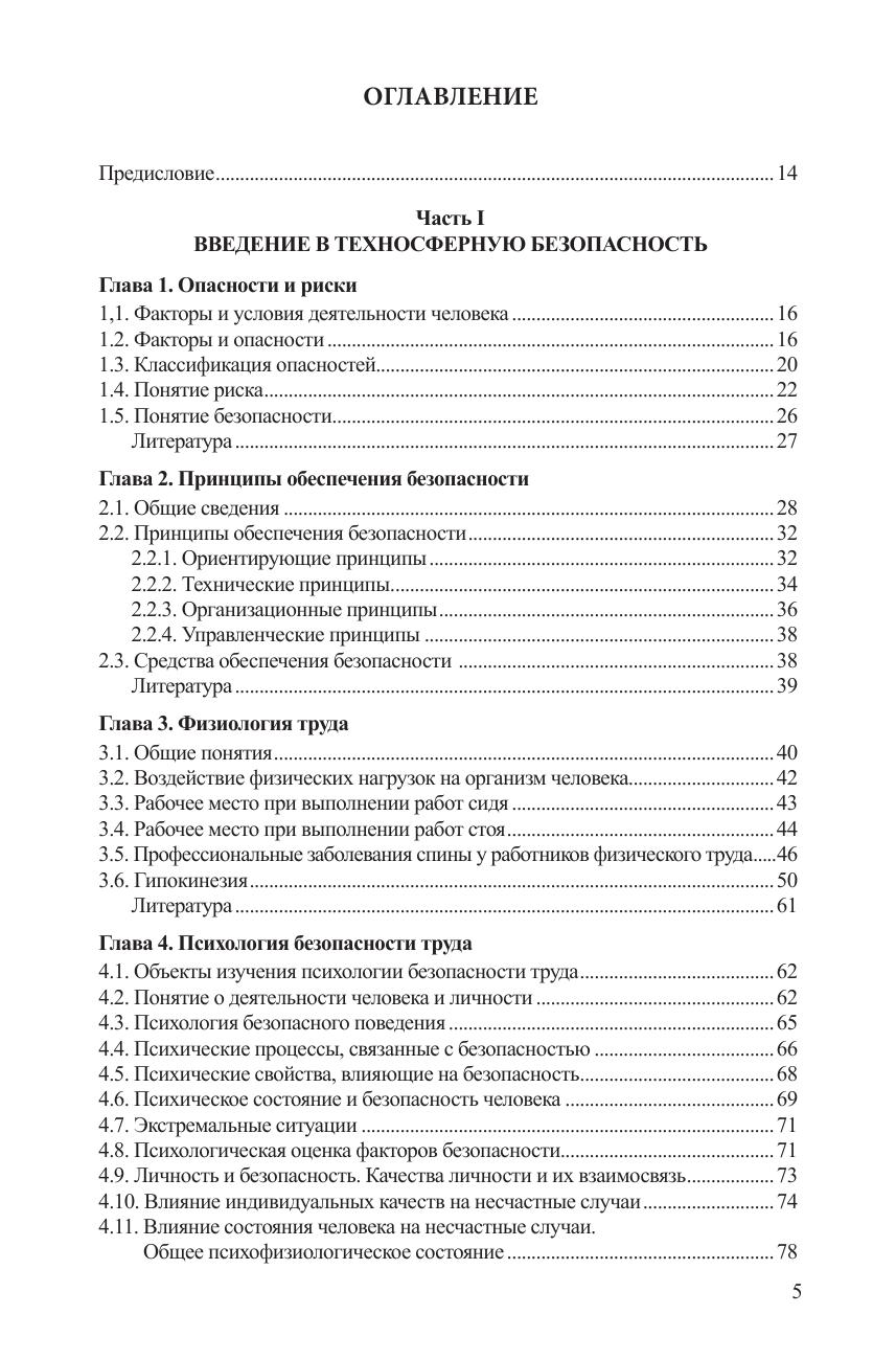 Рассмотрены основы управления безопасностью, даны понятия опасностей и рисков. Приведены сведения о физиологии и психологии труда. Изложены основы защиты от опасных и вредных производственных факторов, включая вредные вещества, шум, вибрацию и др., приведены принципы электромагнитной и радиационной безо- пасности. Содержатся сведения об электробезопасности, безопасности подъемно-транспортных машин и устройств, работающих под давлением. Описаны методы проектирования производственного освещения. Даны основы пожарной безопасности и безопасности в чрезвычайных ситуациях. Освещены правовые, организационные и экономические положения обеспечения безопасности. Для студентов, получающих образование по направлениям подготовки «Менеджмент» и «Техносферная безопасность». Может использоваться в учебном процессе по широкому кругу направлений и специальностей вузов, где предусмотрено изучение дисциплины «Безопасность жизденеятельности».