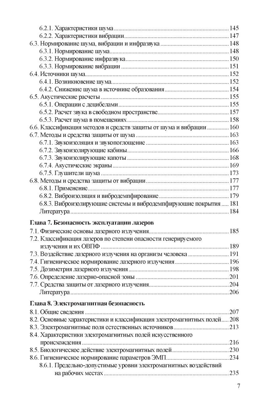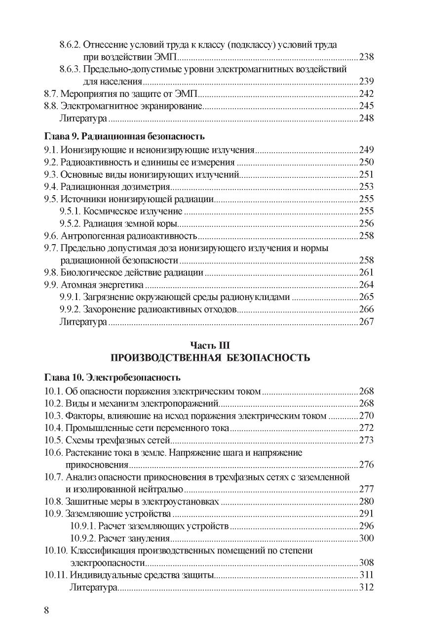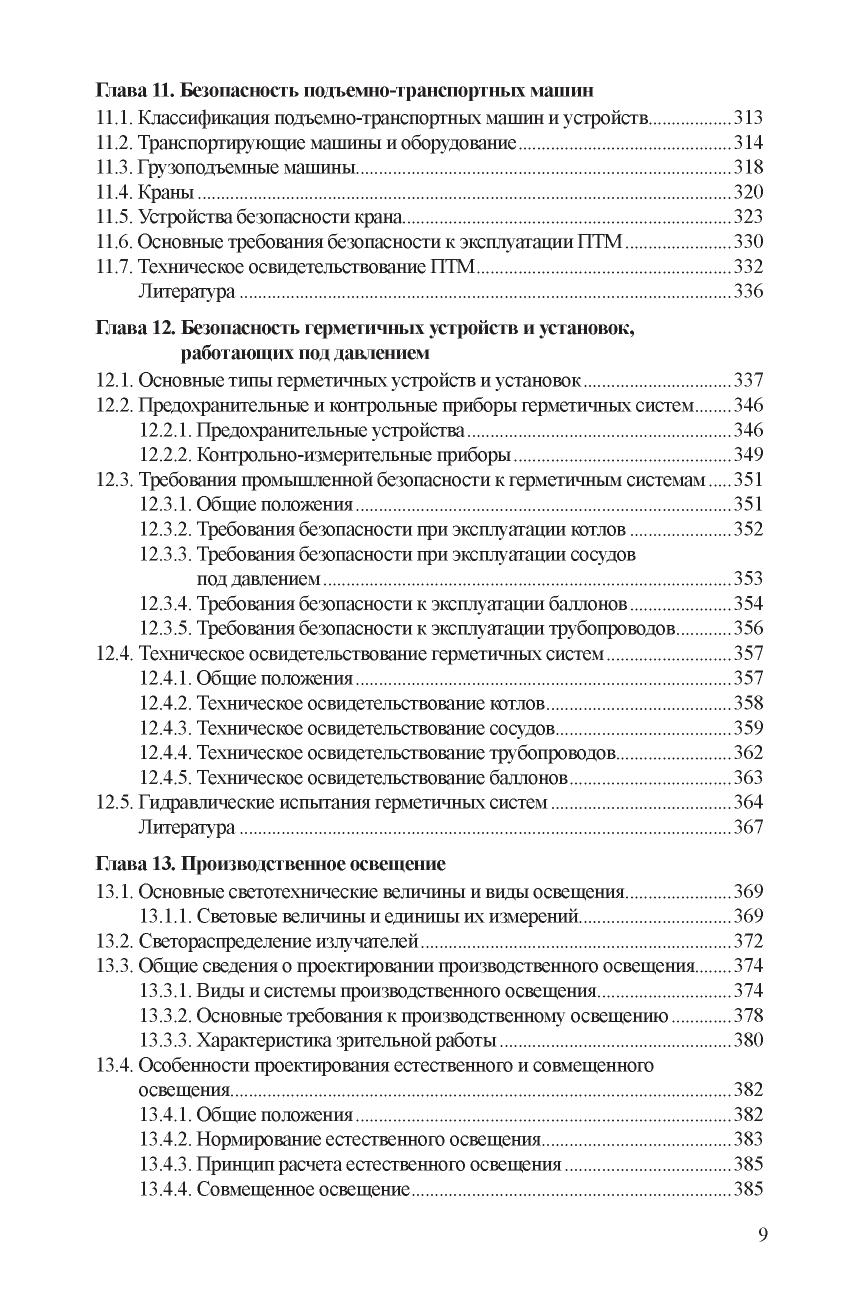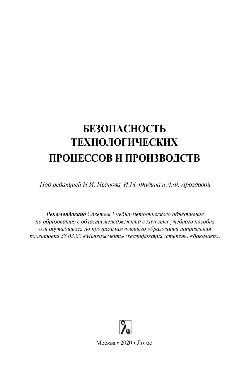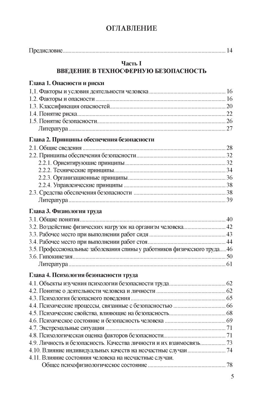 Рассмотрены основы управления безопасностью, даны понятия опасностей и рисков. Приведены сведения о физиологии и психологии труда. Изложены основы защиты от опасных и вредных производственных факторов, включая вредные вещества, шум, вибрацию и др., приведены принципы электромагнитной и радиационной безопасности. Содержатся сведения об электробезопасности, безопасности подъемнотранспортных машин и устройств, работающих под давлением. Описаны методы проектирования производственного освещения. Даны основы пожарной безопасности и безопасности в чрезвычайных ситуациях. Освещены правовые, организационные и экономические положения обеспечения безопасности. Для студентов, получающих образование по направлениям подготовки «Менеджмент» и «Техносферная безопасность». Может использоваться в учебном процессе по широкому кругу направлений и специальностей вузов, где предусмотрено изучение дисциплины «Безопасность жизденеятельности».
