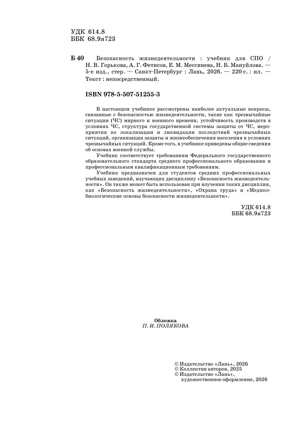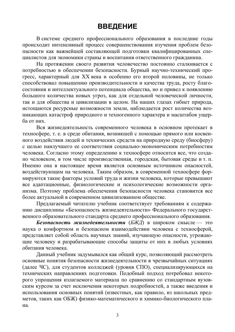 В настоящем учебнике рассмотрены наиболее актуальные вопросы, связанные с безопасностью жизнедеятельности, такие как чрезвычайные ситуации (ЧС) мирного и военного времени, устойчивость производств в условиях ЧС, структура государственной системы защиты от ЧС, мероприятия по локализации и ликвидации последствий чрезвычайных ситуаций, организация защиты и жизнеобеспечения населения в условиях чрезвычайных ситуаций. Кроме того, в учебнике приведены общие сведения об основах военной службы. Учебник соответствует требованиям Федерального государственного образовательного стандарта среднего профессионального образования и профессиональным квалификационным требованиям. Учебник предназначен для студентов средних профессиональных учебных заведений, изучающих дисциплину «Безопасность жизнедеятельности». Он также может быть использован при изучении таких дисциплин, как «Безопасность жизнедеятельности», «Охрана труда» и «Медико-биологические основы безопасности жизнедеятельности».