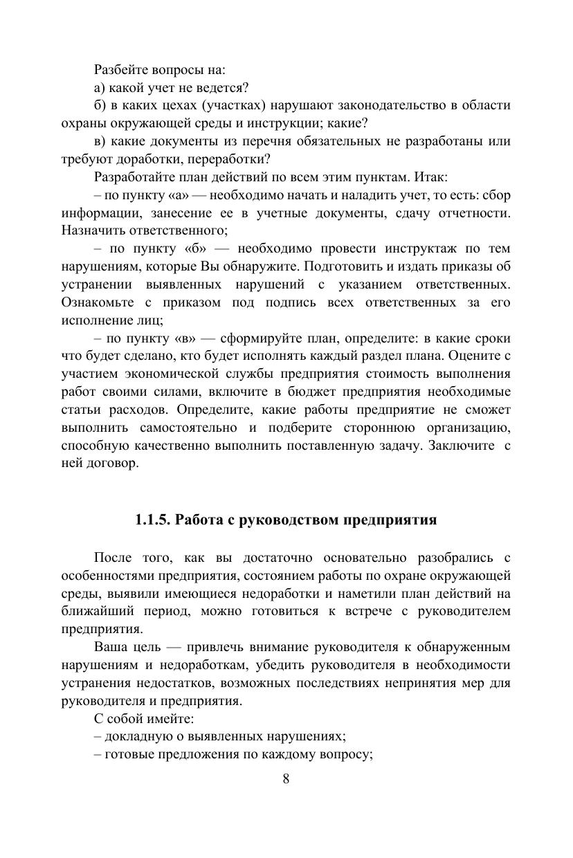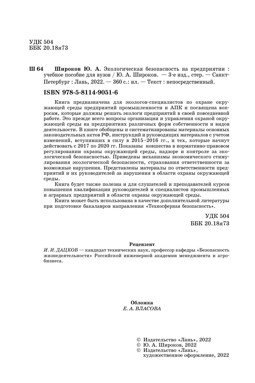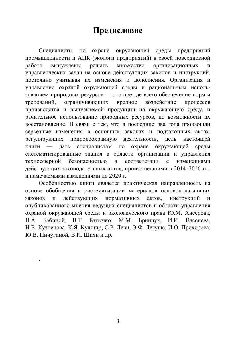 Книга предназначена для экологов-специалистов по охране окружающей среды предприятий промышленности и АПК и посвящена вопросам, которые должны решать экологи предприятий в своей повседневной работе. Это прежде всего вопросы организации и управления охраной окружающей среды на предприятиях различных форм собственности и видов деятельности. В книге обобщены и систематизированы материалы основных законодательных актов РФ, инструкций и руководящих материалов с учетом изменений, вступивших в силу в 2015–2016 гг. и тех, которые начнут действовать с 2017 по 2020 гг. Показаны новшества в нормативноправовом регулировании охраны окружающей среды, надзоре и контроле за экологической безопасностью. Приведены механизмы экономического стимулирования экологической безопасности, страхования ответственности за возможные нарушения. Представлены материалы по ответственности предприятий и их руководителей за нарушения в области охраны окружающей среды.