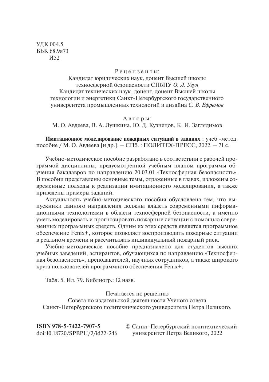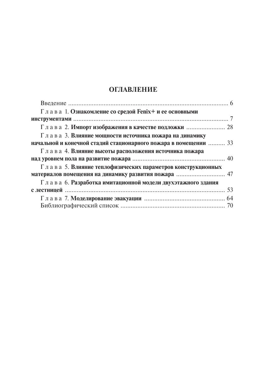 Учебно-методическое пособие разработано в соответствии с рабочей программой дисциплины, предусмотренной учебным планом программы обучения бакалавров по направлению 20.03.01 «Техносферная безопасность». В пособии представлены основные темы, отраженные в главах, изложены современные подходы к реализации имитационного моделирования, а также приведены примеры заданий. Актуальность учебно-методического пособия обусловлена тем, что выпускники данного направления должны владеть современными информационными технологиями в области техносферной безопасности, а именно уметь моделировать и прогнозировать пожарные ситуации с помощью современных программных средств. Одним их этих средств является программное обеспечение Fenix+, которое позволяет воспроизводить пожарные ситуации в реальном времени и рассчитывать индивидуальный пожарный риск. Учебно-методическое пособие предназначено для студентов высших учебных заведений, аспирантов, обучающихся по направлению «Техносферная безопасность», преподавателей, научных сотрудников, а также широкого круга пользователей программного обеспечения Fenix+.