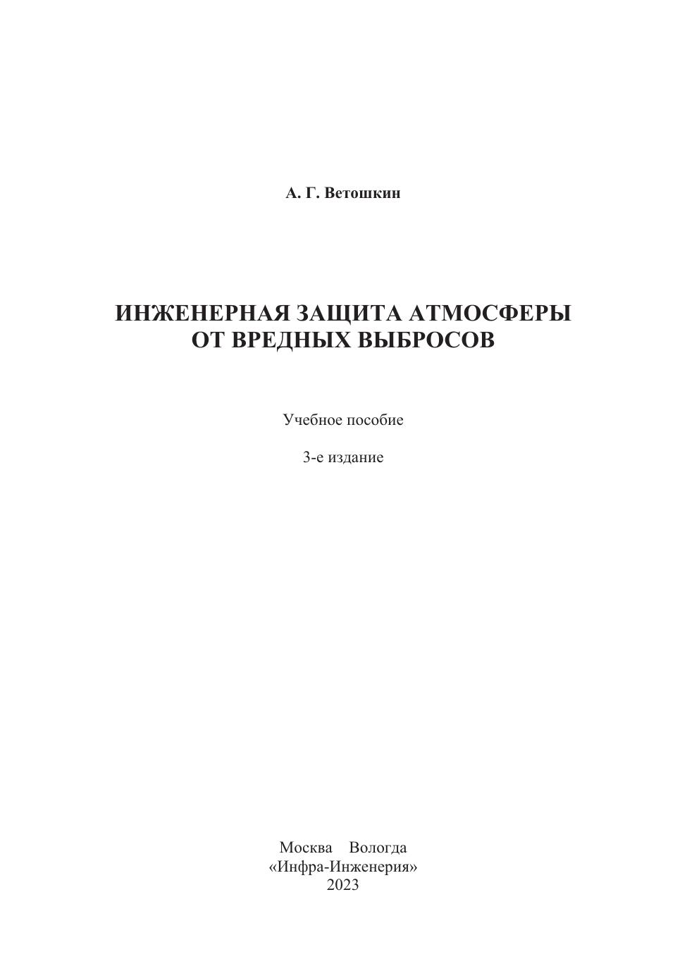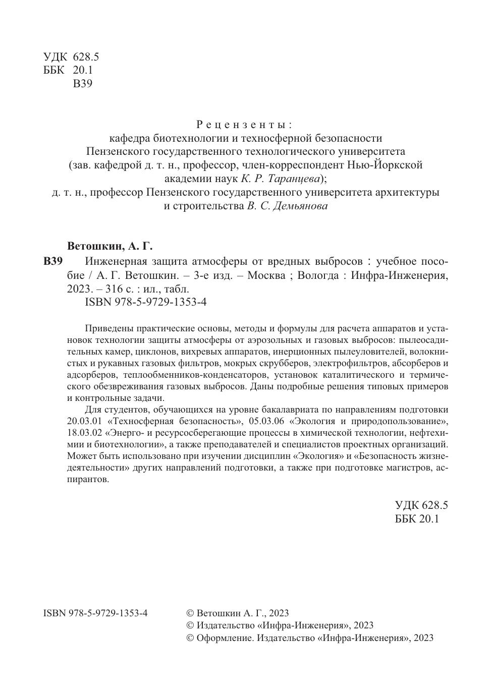 Приведены практические основы, методы и формулы для расчета аппаратов и установок технологии защиты атмосферы от аэрозольных и газовых выбросов: пылеосадительных камер, циклонов, вихревых аппаратов, инерционных пылеуловителей, волокнистых и рукавных газовых фильтров, мокрых скрубберов, электрофильтров, абсорберов и адсорберов, теплообменников-конденсаторов, установок каталитического и термического обезвреживания газовых выбросов. Даны подробные решения типовых примеров и контрольные задачи.