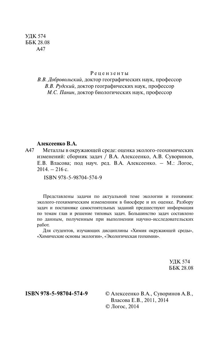 Представлены задачи по актуальной теме экологии и геохимии: эколого-геохимическим изменениям в биосфере и их оценке. Разбору задач и постановке самостоятельных заданий предшествуют информация по темам глав и решение типовых задач. Большинство задач составлено по данным, полученным при выполнении научно-исследовательских работ. Для студентов, изучающих дисциплины «Химия окружающей среды», «Химические основы экологии», «Экологическая геохимия».