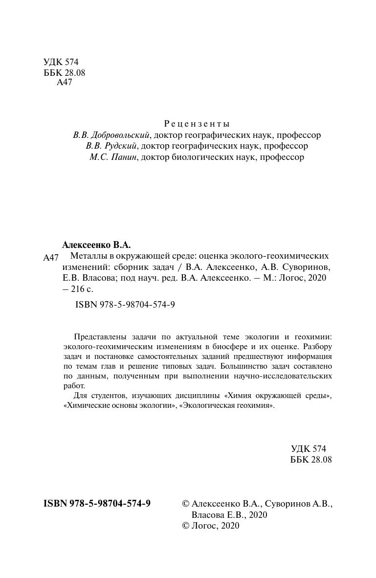 Представлены задачи по актуальной теме экологии и геохимии: эколого-геохимическим изменениям в биосфере и их оценке. Разбору задач и постановке самостоятельных заданий предшествуют информация по темам глав и решение типовых задач. Большинство задач составлено по данным, полученным при выполнении научно-исследовательских работ. Для студентов, изучающих дисциплины «Химия окружающей среды», «Химические основы экологии», «Экологическая геохимия».