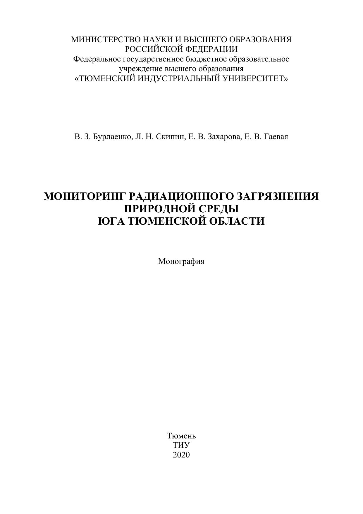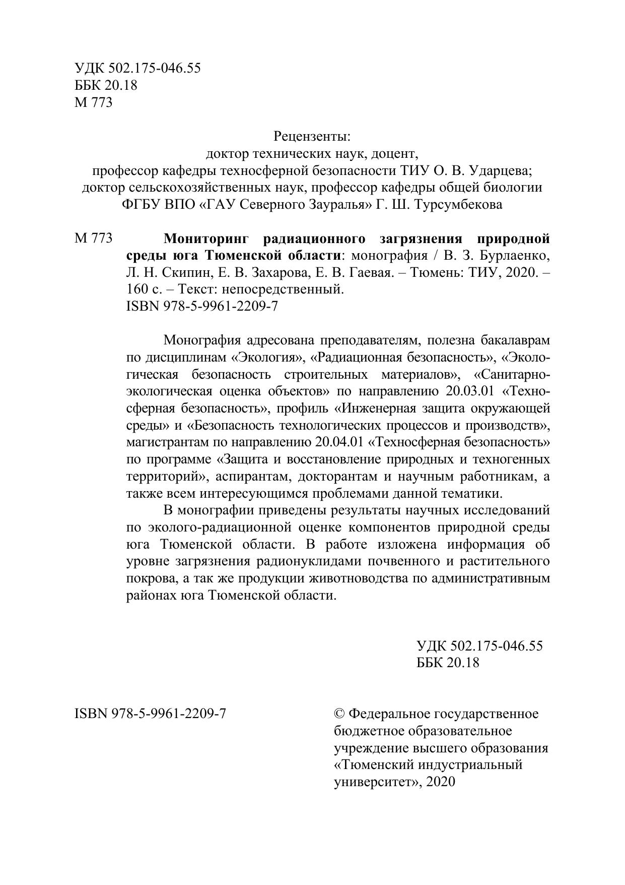 Монография адресована преподавателям, полезна бакалаврам по дисциплинам «Экология», «Радиационная безопасность», «Экологическая безопасность строительных материалов», «Санитарноэкологическая оценка объектов» по направлению 20.03.01 «Техносферная безопасность», профиль «Инженерная защита окружающей среды» и «Безопасность технологических процессов и производств», магистрантам по направлению 20.04.01 «Техносферная безопасность» по программе «Защита и восстановление природных и техногенных территорий», аспирантам, докторантам и научным работникам, а также всем интересующимся проблемами данной тематики. В монографии приведены результаты научных исследований по эколого-радиационной оценке компонентов природной среды юга Тюменской области. В работе изложена информация об уровне загрязнения радионуклидами почвенного и растительного покрова, а так же продукции животноводства по административным районах юга Тюменской области
