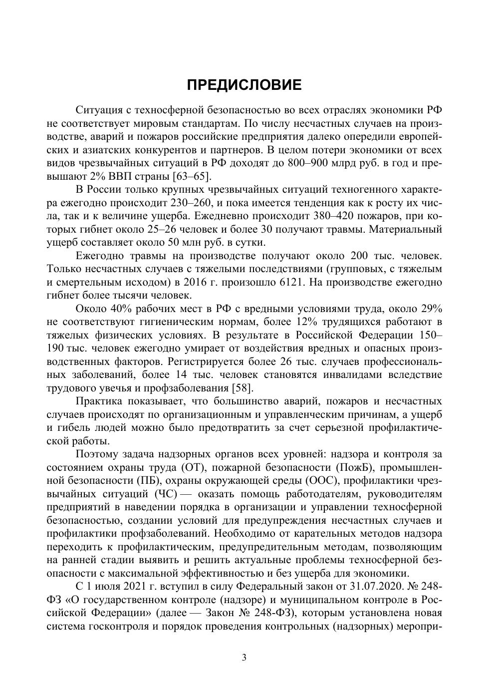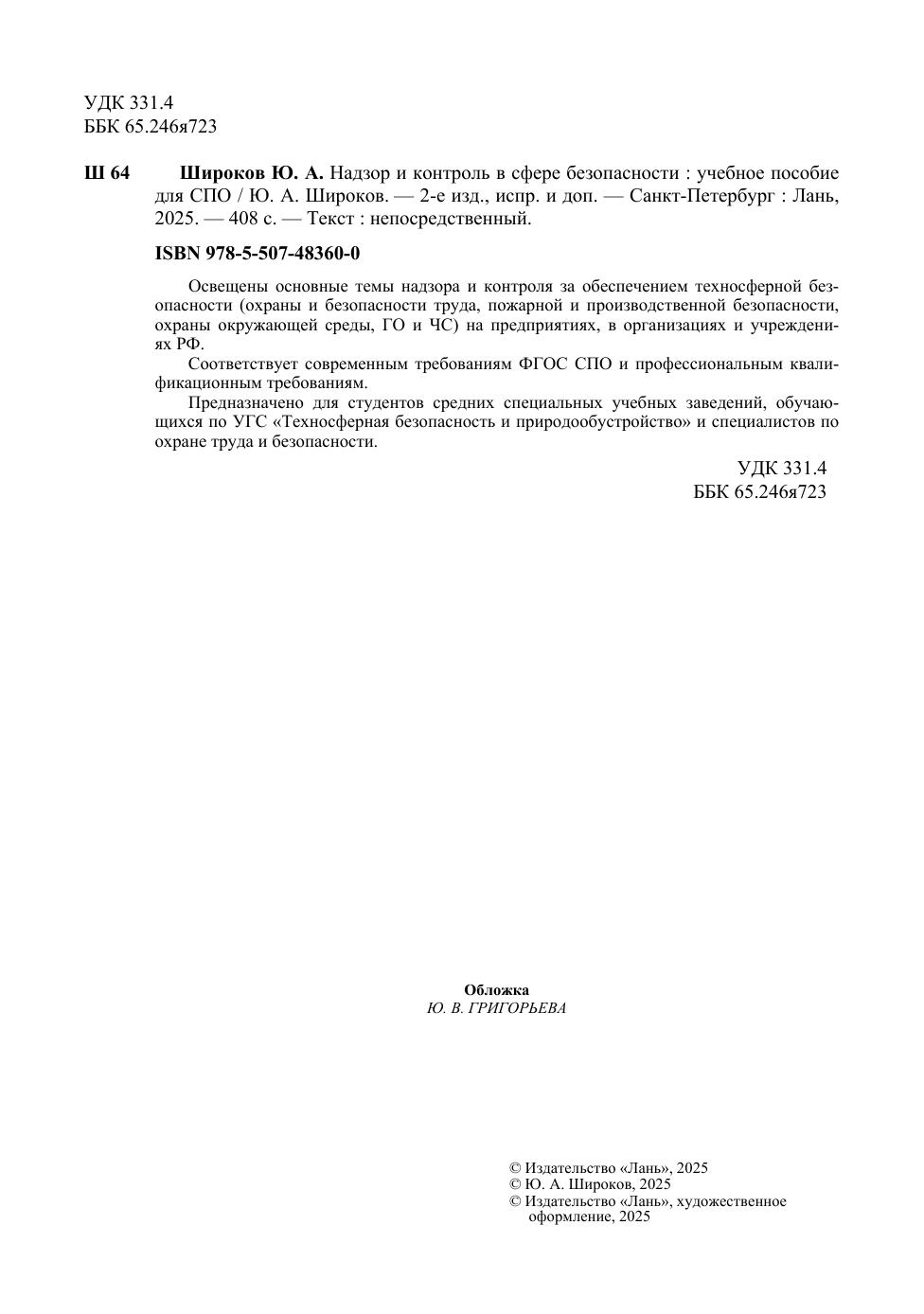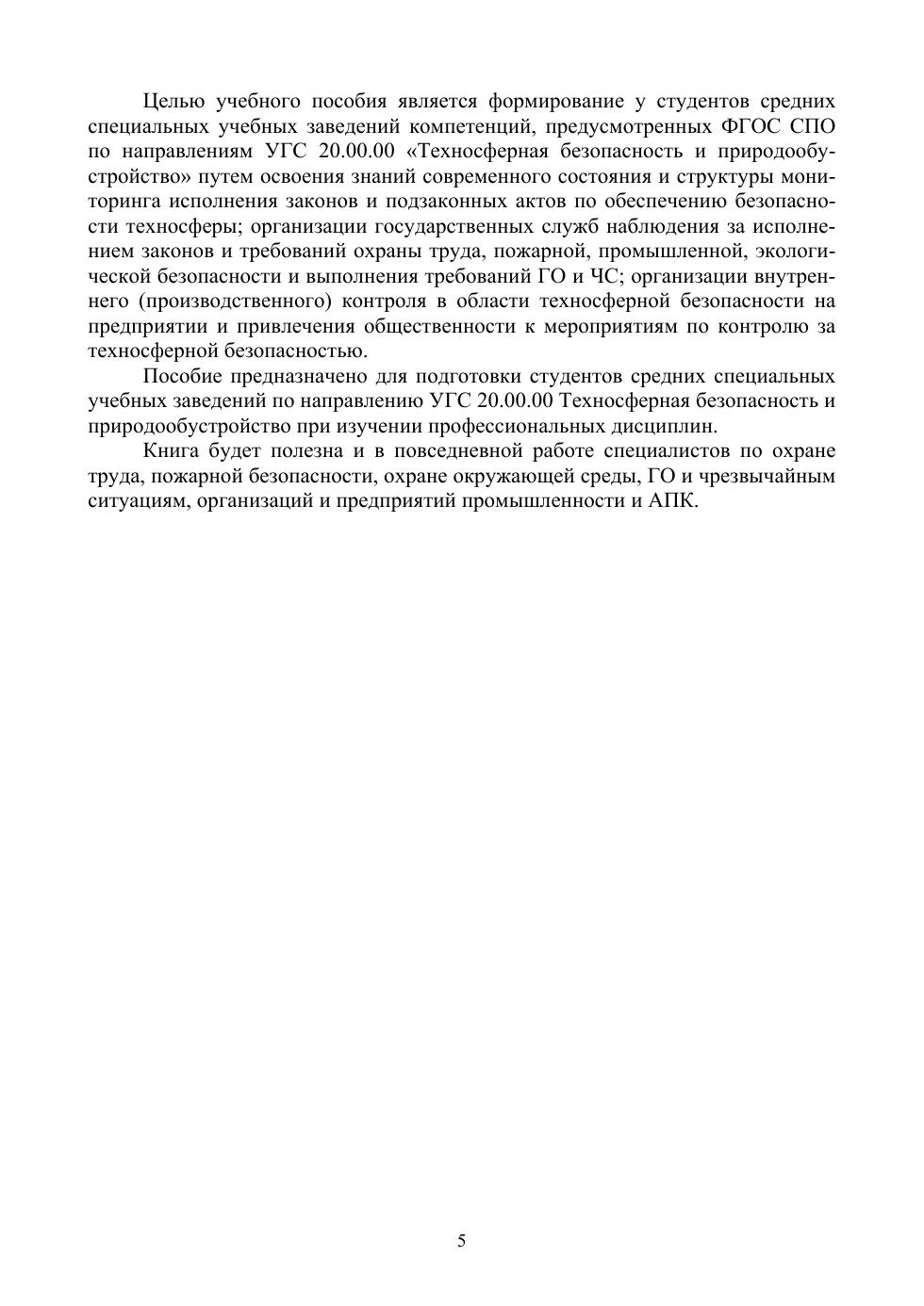 Освещены основные темы надзора и контроля за обеспечением техносферной безопасности (охраны и безопасности труда, пожарной и производственной безопасности, охраны окружающей среды, ГО и ЧС) на предприятиях, в организациях и учреждениях РФ. Соответствует современным требованиям ФГОС СПО и профессиональным квалификационным требованиям. Предназначено для студентов средних специальных учебных заведений, обучающихся по УГС «Техносферная безопасность и природообустройство» и специалистов по охране труда и безопасности.