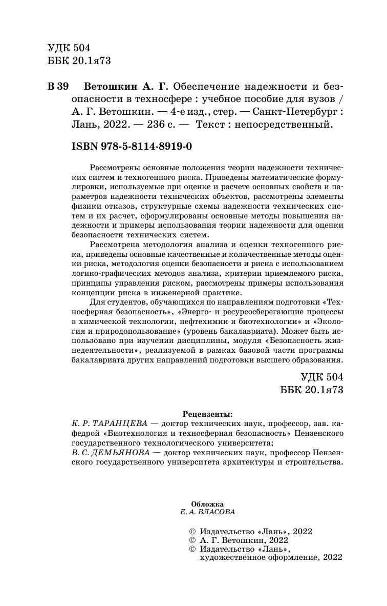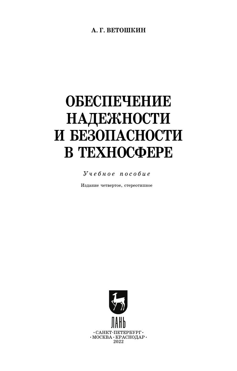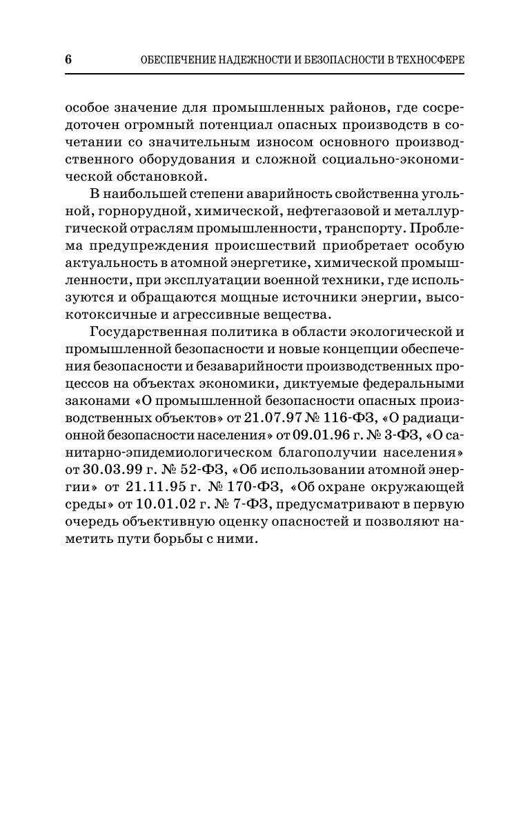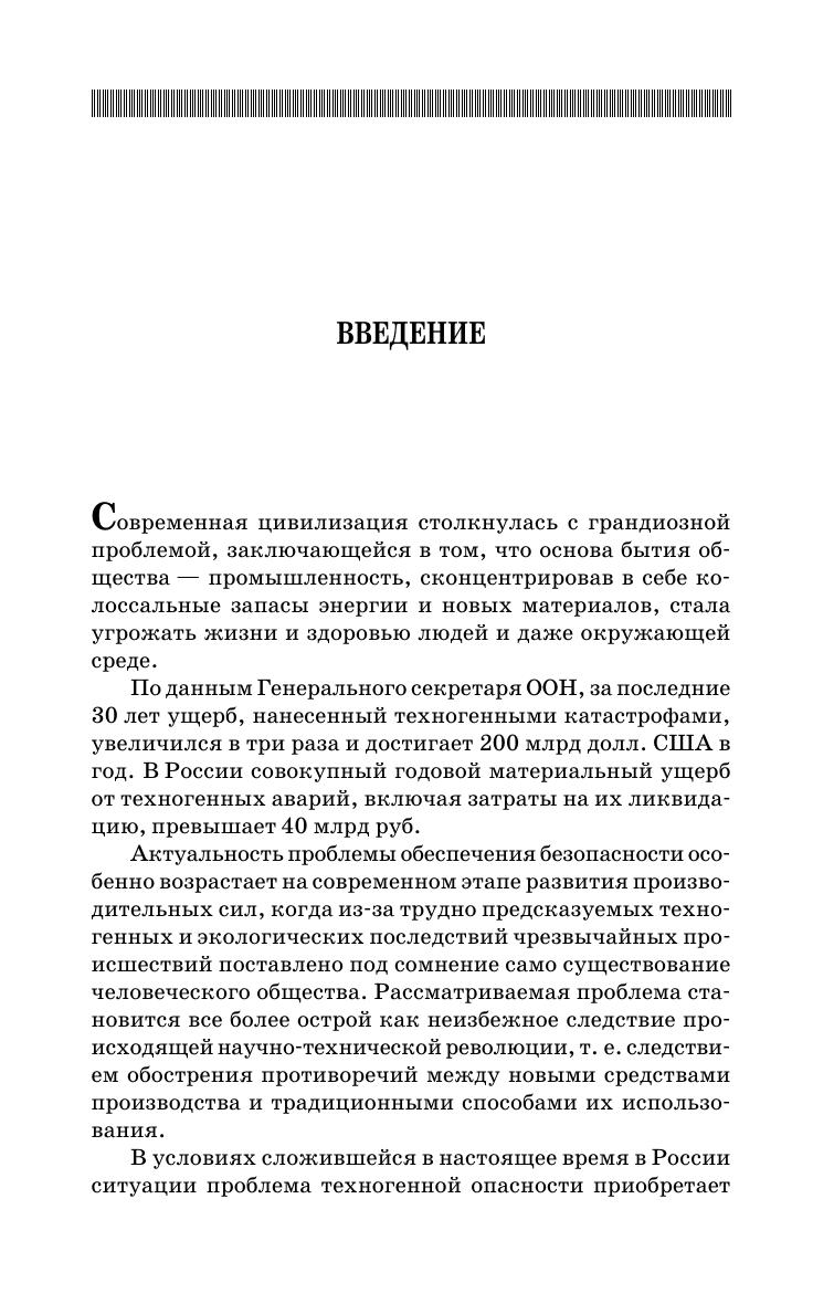 Рассмотрены основные положения теории надежности технических систем и техногенного риска. Приведены математические формулировки, используемые при оценке и расчете основных свойств и параметров надежности технических объектов, рассмотрены элементы физики отказов, структурные схемы надежности технических систем и их расчет, сформулированы основные методы повышения надежности и примеры использования теории надежности для оценки безопасности технических систем.