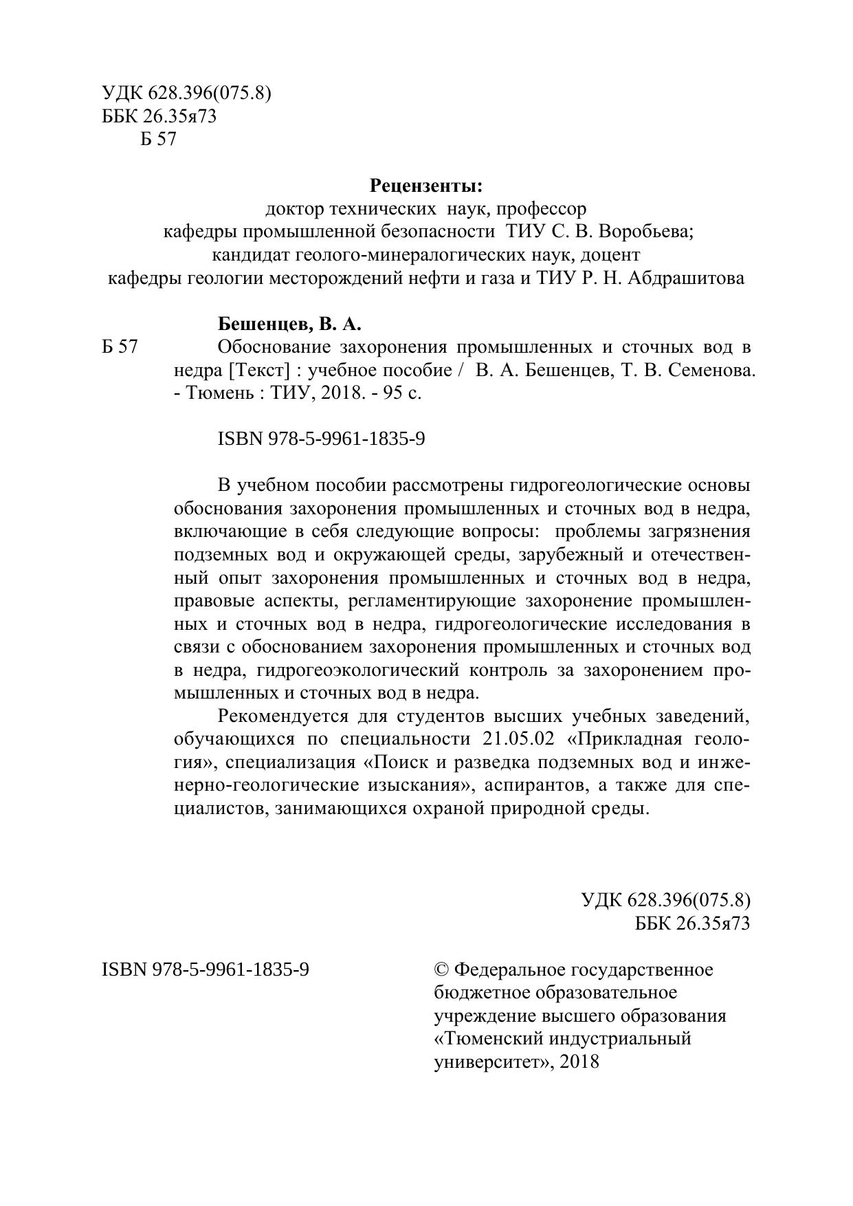 Рекомендуется для студентов высших учебных заведений, обучающихся по специальности 21.05.02 «Прикладная геология», специализация «Поиск и разведка подземных вод и инже-нерно-геологические изыскания», аспирантов, а также для специалистов, занимающихся охраной природной среды.