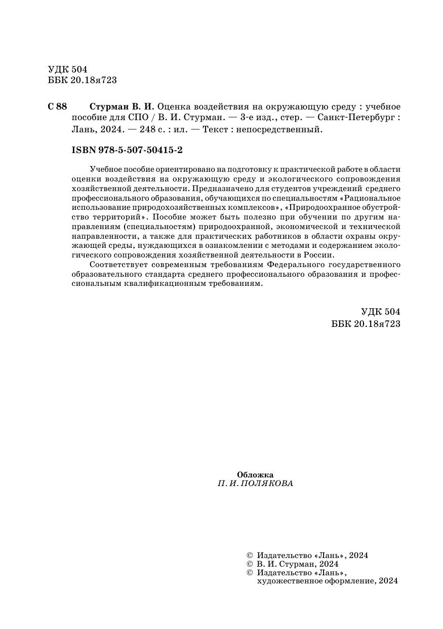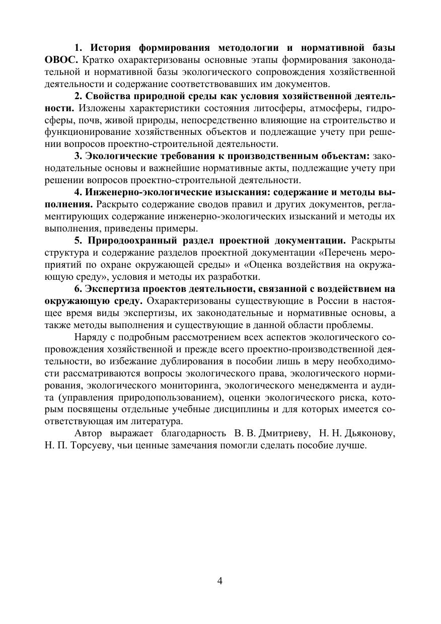 Учебное пособие ориентировано на подготовку к практической работе в области оценки воздействия на окружающую среду и экологического сопровождения хозяйственной деятельности. Предназначено для студентов учреждений среднего профессионального образования, обучающихся по специальностям «Рациональное использование природохозяйственных комплексов», «Природоохранное обустройство территорий». Пособие может быть полезно при обучении по другим направлениям (специальностям) природоохранной, экономической и технической направленности, а также для практических работников в области охраны окружающей среды, нуждающихся в ознакомлении с методами и содержанием экологического сопровождения хозяйственной деятельности в России. Соответствует современным требованиям Федерального государственного образовательного стандарта среднего профессионального образования и профессиональным квалификационным требованиям.
