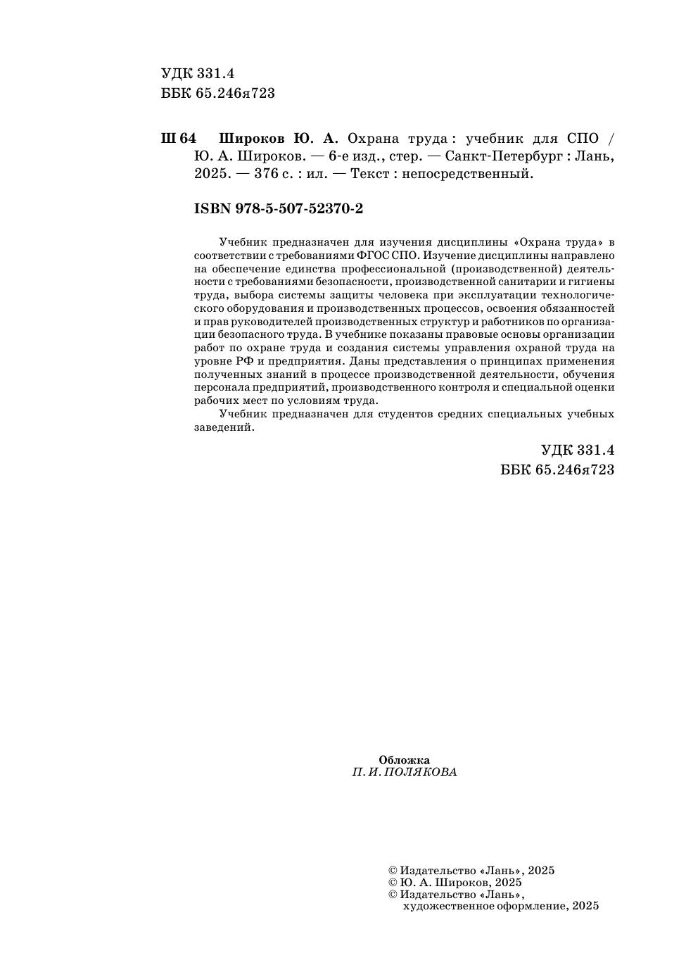 Учебник предназначен для изучения дисциплины «Охрана труда» в соответствии с требованиями ФГОС СПО. Изучение дисциплины направлено на обеспечение единства профессиональной (производственной) деятельности с требованиями безопасности, производственной санитарии и гигиены труда, выбора системы защиты человека при эксплуатации технологического оборудования и производственных процессов, освоения обязанностей и прав руководителей производственных структур и работников по организации безопасного труда. В учебнике показаны правовые основы организации работ по охране труда и создания системы управления охраной труда на уровне РФ и предприятия. Даны представления о принципах применения полученных знаний в процессе производственной деятельности, обучения персонала предприятий, производственного контроля и специальной оценки рабочих мест по условиям труда. Учебник предназначен для студентов средних специальных учебных заведений.