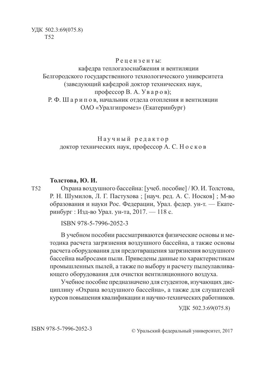 В учебном пособии рассматриваются физические основы и методика расчета загрязнения воздушного бассейна, а также основы расчета оборудования для предотвращения загрязнения воздушного бассейна выбросами пыли. Приведены данные по характеристикам промышленных пылей, а также по выбору и расчету пылеулавливающего оборудования для очистки вентиляционного воздуха. Учебное пособие предназначено для студентов, изучающих дисциплину «Охрана воздушного бассейна», а также для слушателей курсов повышения квалификации и научно-технических работников.