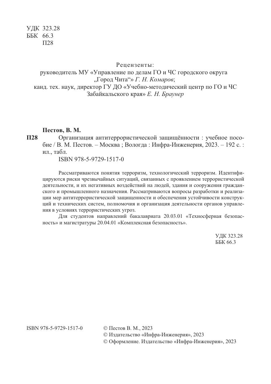 Рассматриваются понятия терроризм, технологический терроризм. Идентифицируются риски чрезвычайных ситуаций, связанных с проявлением террористической деятельности, и их негативных воздействий на людей, здания и сооружения гражданского и промышленного назначения. Рассматриваются вопросы разработки и реализации мер антитеррористической защищенности и обеспечения устойчивости конструкций и технических систем, полномочия и организация деятельности органов управления в условиях террористических угроз.
