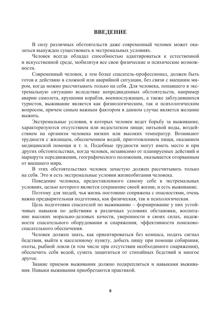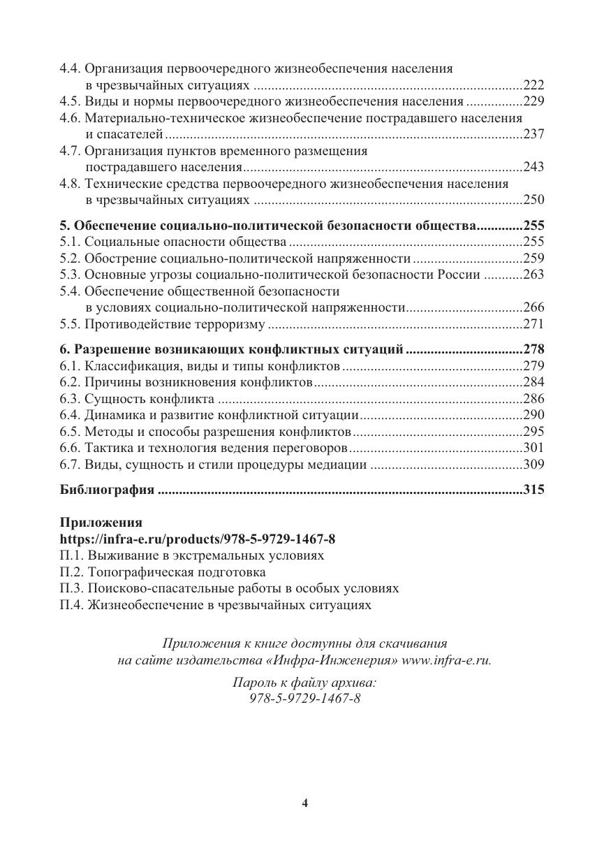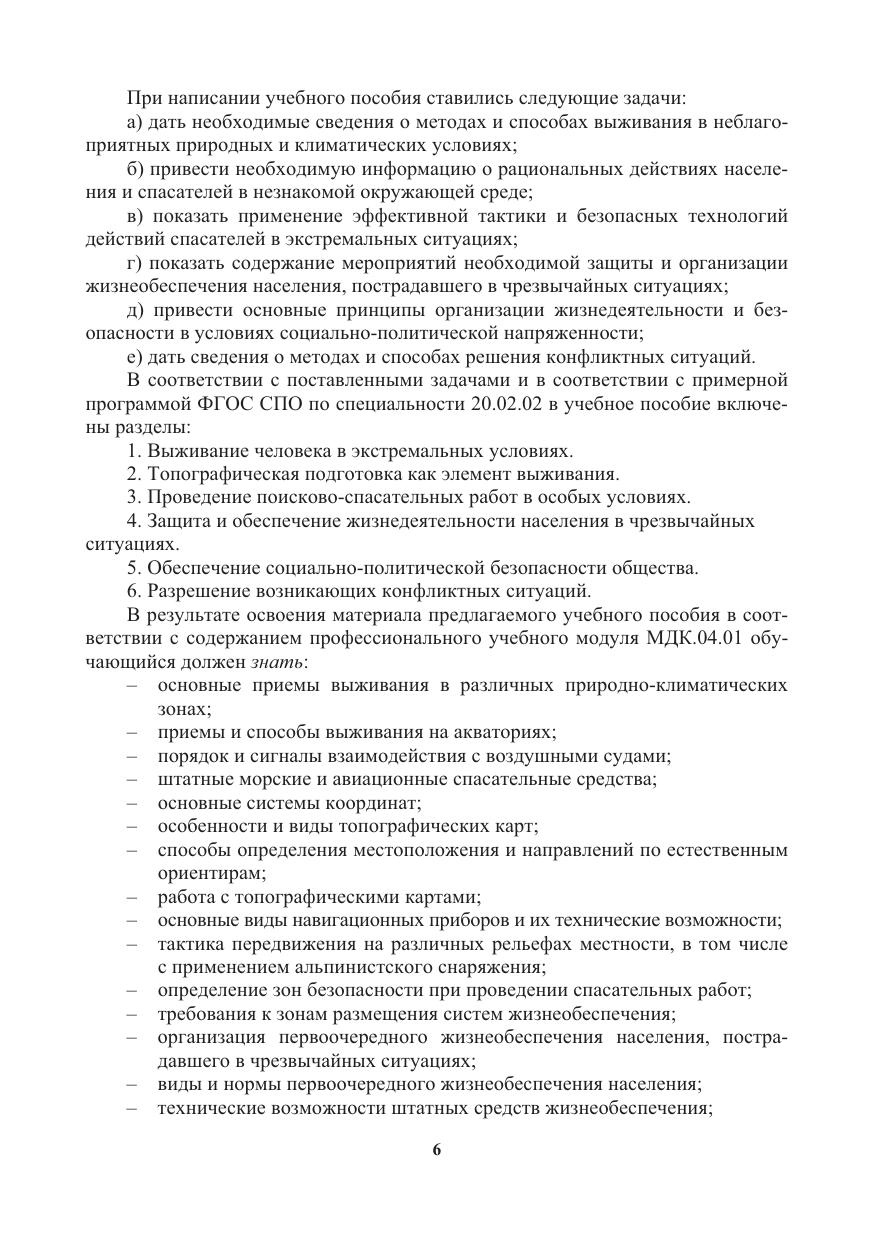 Содержится информация о способах выживания человека в экстремальных ситуациях природного и техногенного характера. Освещаются вопросы топографической подготовки, способы ориентирования в окружающей среде и работа с топогра-фическими картами. Приводятся сведения о безопасных действиях спасателей в особых условиях проведения поисково-спасательных работ. Даются описания мероприятий обеспечения безопасности и первоочередного жизнеобеспечения населения при чрезвычайных ситуациях. Содержится информация об организации и обеспечении безопасности в условиях социально-политической напряженности. Приводятся сведения о методах и способах разрешения конфликтных ситуаций.