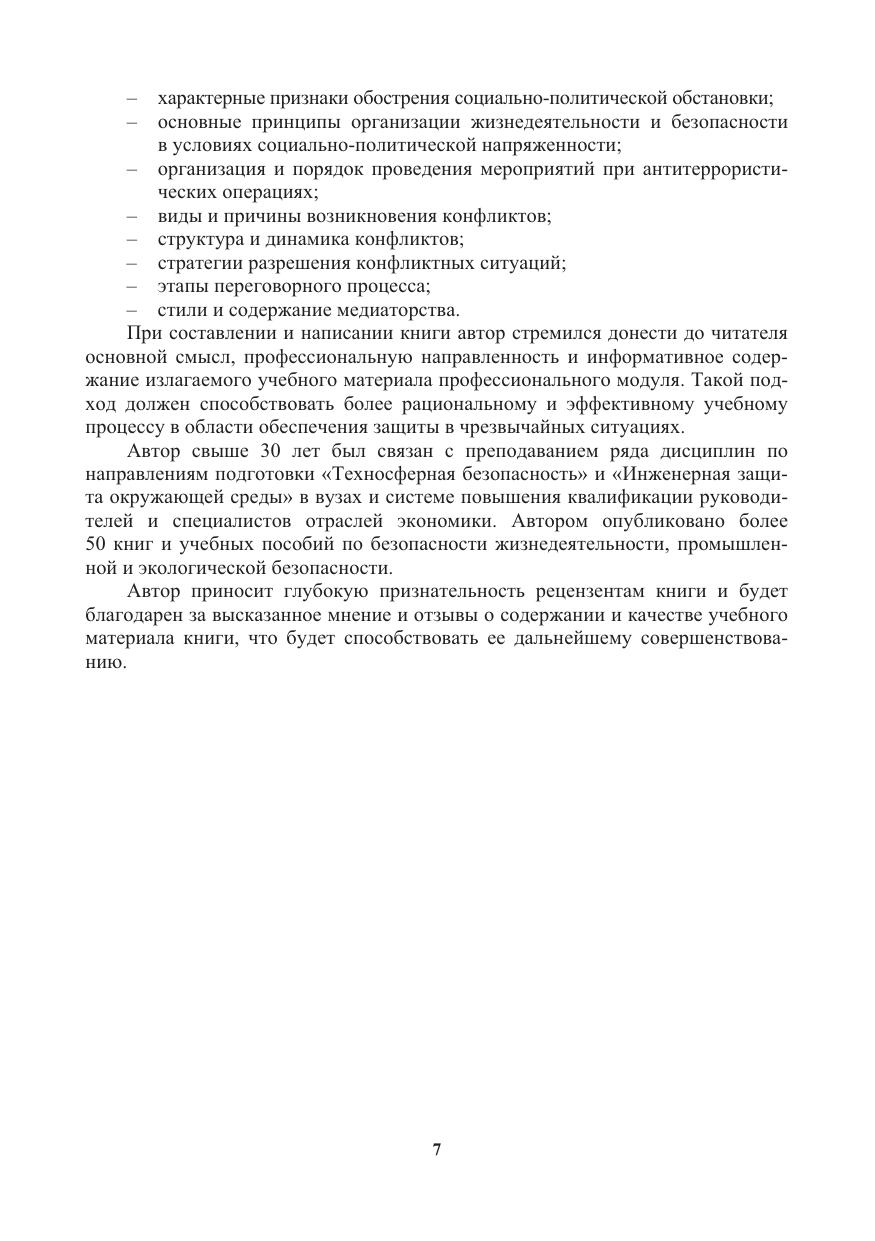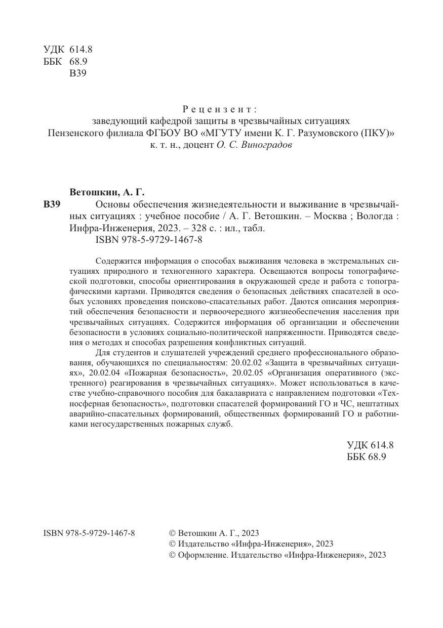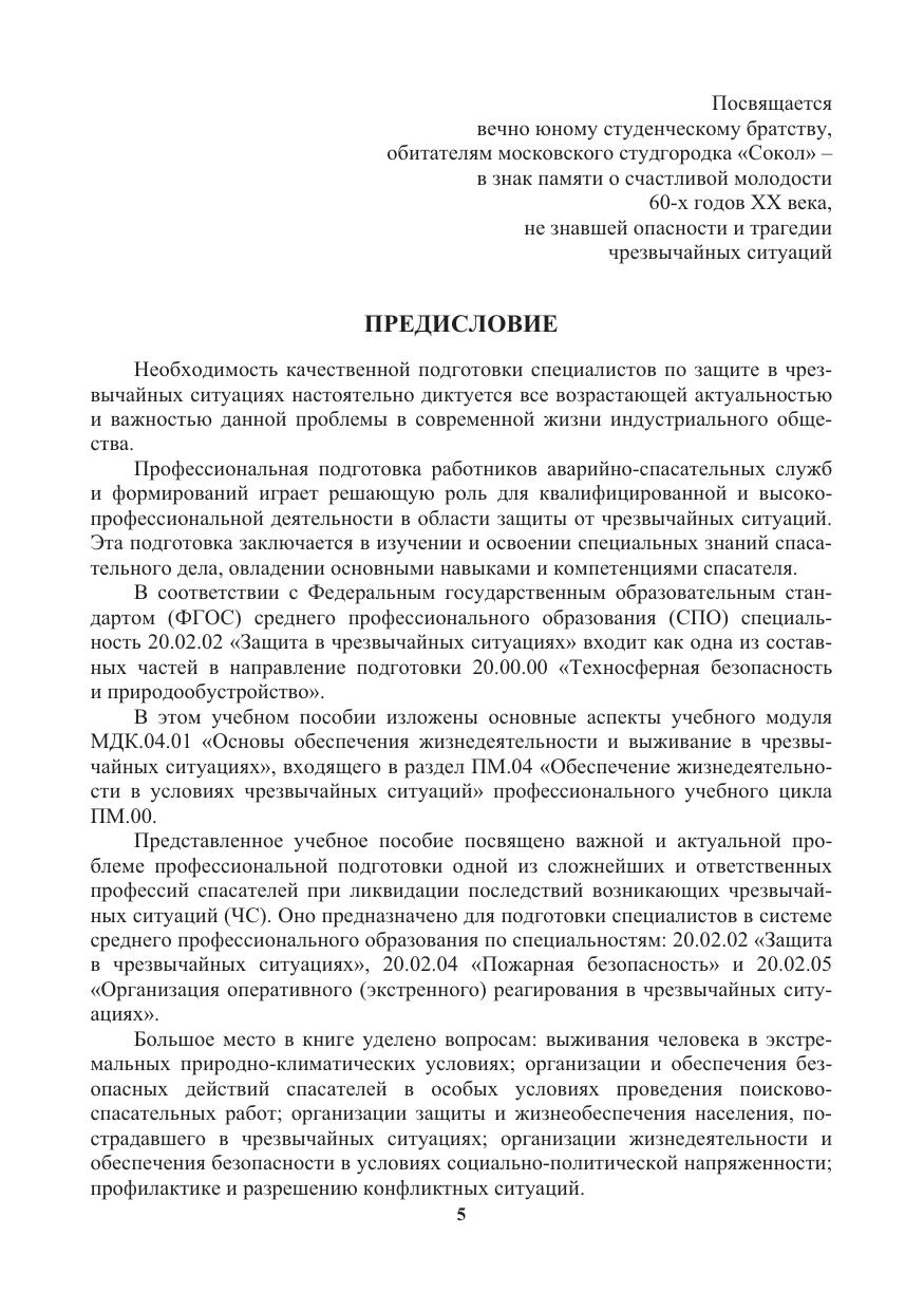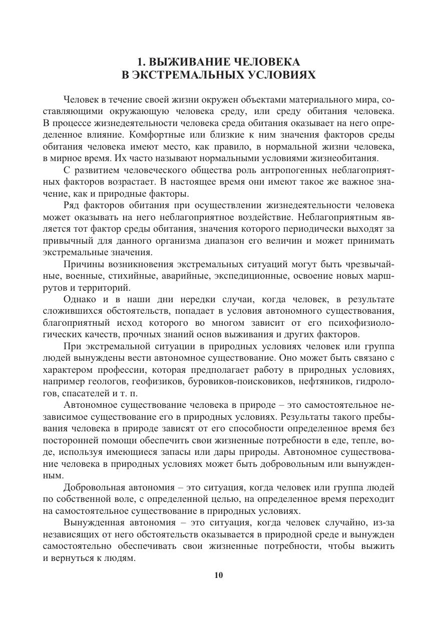 Содержится информация о способах выживания человека в экстремальных ситуациях природного и техногенного характера. Освещаются вопросы топографической подготовки, способы ориентирования в окружающей среде и работа с топогра-фическими картами. Приводятся сведения о безопасных действиях спасателей в особых условиях проведения поисково-спасательных работ. Даются описания мероприятий обеспечения безопасности и первоочередного жизнеобеспечения населения при чрезвычайных ситуациях. Содержится информация об организации и обеспечении безопасности в условиях социально-политической напряженности. Приводятся сведения о методах и способах разрешения конфликтных ситуаций.